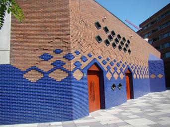 Keywords: amsterdam building structure urban design blue red outside architecture sky clouds