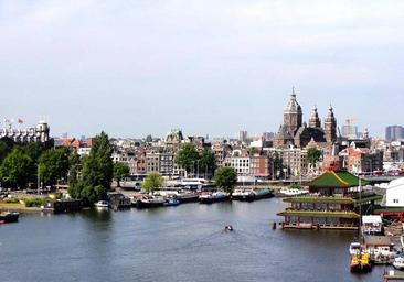 Keywords: amsterdam city buildings skyline architecture bay harbor water boats ships reflections trees outside summer spring urban