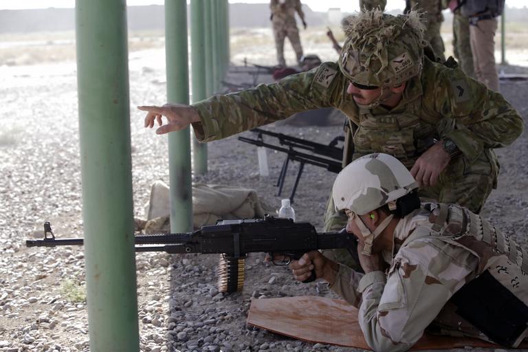 Keywords: An Australian trainer coaches an Iraqi soldier on a PK machine gun at Camp Taji in July 2016.jpg en An Australian coalition trainer coaches an Iraqi soldier on proper sight picture techniques on a Pulemyot Kalashnikova machine gun during squad automatic weapons training at Camp Taji Iraq July 27 2016 The ability to accurately fire a machine gun supplements the Iraqi soldiers ™ overall tactical capabilities Combined Joint Task Force-Operation Inherent Resolve is a multinational effort to weaken and destroy Islamic State in Iraq and the Levant operations in the Middle East region and around the world U S Army photo by Sgt Joshua Powell 2016-07-26 20 00 00 https //www dvidshub net/image/2789871/task-group-taji-conducts-squad-automatic-weapons-training U S Army photo by Sgt Joshua Powell other versions PD-USGov Australian contribution to the military intervention against ISIL Camp Taji Military training in Iraq Soldiers of Iraq post-2003 Soldiers of Australia People with PK/PKS machine guns |