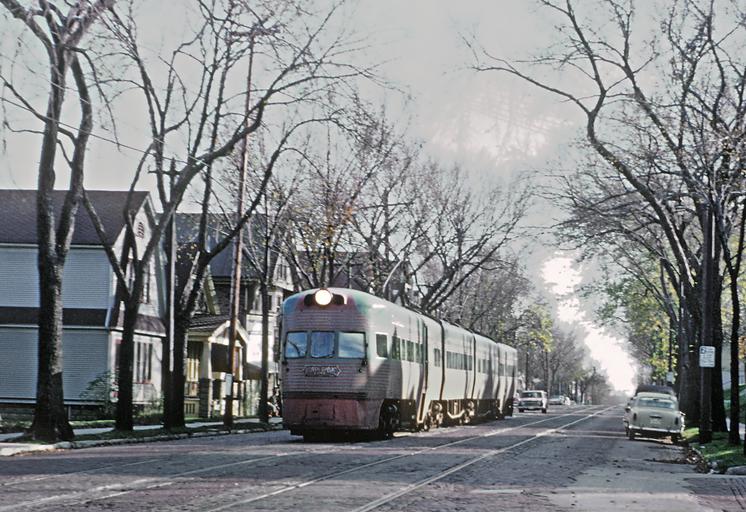 | Keywords: chicago north shore milwaukee outdoor I don't know how Roger Puta did it, but he photographed the same northbound Electroliner both on 5th and 6th Streets on October 21, 1962 only a couple blocks apart. Here are his captions. 1. CNS&M Train 805, The Electroliner on S. 5th St. approaching W. Orchard St. 2. CNS&M Train 805, The Electroliner on S. 5th St. near W. Orchard St. 3. CNS&M Train 805, The Electroliner coming out of private right-of-way onto S. 6th St. at W. Scott Ave. [Look who has the railfan seats. I don't remember. Are they looking at a blank wall?] I don't know how Roger Puta did it, but he photographed the same northbound Electroliner both on 5th and 6th Streets on October 21, 1962 only a couple blocks apart. Here are his captions. 1. CNS&M Train 805, The Electroliner on S. 5th St. approaching W. Orchard St. 2. CNS&M Train 805, The Electroliner on S. 5th St. near W. Orchard St. 3. CNS&M Train 805, The Electroliner coming out of private right-of-way onto S. 6th St. at W. Scott Ave. [Look who has the railfan seats. I don't remember. Are they looking at a blank wall?] |