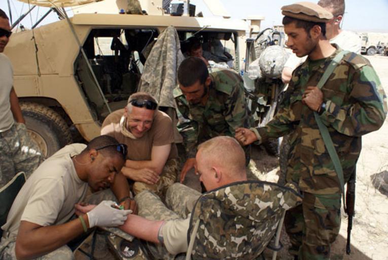 | Keywords: ANA continues to train, lead with support of Soldiers DVIDS45897.jpg en Medics with the Afghan National Army look on as Army Maj Marc Daniels operations officer with the 3rd Brigade 205th Regional Security Assistance Command Logistics Support Team administers a field IV to prevent a heat casualty at Forward Operating Base Robinson in Helmand Province April 9 1999-11-30 Sgt Leeann Lloyd https //www dvidshub net/image/45897 45897 2007-06-04 11 52 HELMAND PROVINCE AF PD-USGov Helmand Province in the War in Afghanistan 2001-present Images from DoD uploaded by Fæ |
