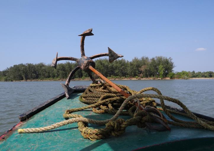Keywords: anchor iron rusted motor boat arabian sea ropes boat river kali estuary karwar india