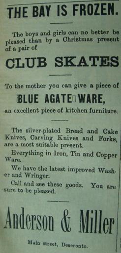 | Keywords: stores skating women 1890s document text Advertisment for Anderson & Miller's store on Main Street, Deseronto, Ontario from the 9 December 1892 edition of The Tribune. The advertisement reads: THE BAY IS FROZEN The boys and girls can no better be pleased than by a Christmas present of a pair of CLUB SKATES ----- To the mother you can give a piece of BLUE AGATE WARE an excellent piece of kitchen furniture -------- The silver plated Bread and Cake Knives, Carving Knives and Forks,are a most suitable present. Everything in Iron, Tin and Copper Ware. We have the latest improved Washer and Wringer. Call and see these goods. You are sure to be pleased. --------- Anderson & Miller Main Street, Deseronto Advertisment for Anderson & Miller's store on Main Street, Deseronto, Ontario from the 9 December 1892 edition of The Tribune. The advertisement reads: THE BAY IS FROZEN The boys and girls can no better be pleased than by a Christmas present of a pair of CLUB SKATES ----- To the mother you can give a piece of BLUE AGATE WARE an excellent piece of kitchen furniture -------- The silver plated Bread and Cake Knives, Carving Knives and Forks,are a most suitable present. Everything in Iron, Tin and Copper Ware. We have the latest improved Washer and Wringer. Call and see these goods. You are sure to be pleased. --------- Anderson & Miller Main Street, Deseronto |