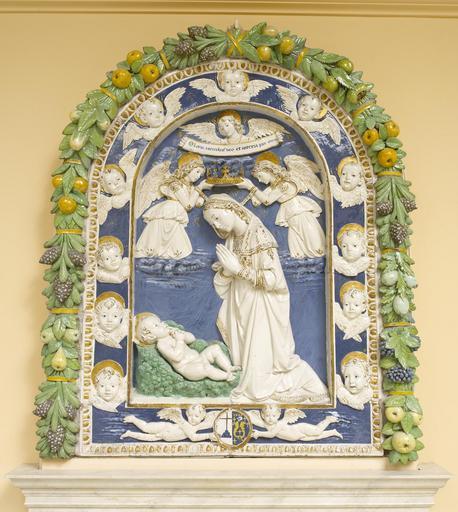 | Keywords: Andrea della Robbia - Virgin Adoring the Christ Child - Walters 27212 (2).jpg This altarpiece was probably commissioned for the marriage of Alessandra Pazzi and Bartolomeo di Rosso Buondelmonti in 1483 Their family heraldry is combined along the bottom edge of the piece Its subject focused on the birth of the Christ Child would have been considered an appropriate devotional image for newlyweds who hoped to bear children Gloria in Excelsis on the scroll held by the angel records the words of the angels who first announced the birth of Christ to the shepherds in the fields Two angels hold a crown above the Virgin's head indicating her status as the future Queen of Heaven The technique of glazing fired clay sculpture was invented by Luca della Robbia ca 1400-1482 The inspiration for Luca's colorful new art form came from maiolica After his death this technique was continued by his son Andrea and other members of the family and workshop well into the 16th century This relief reveals an exquisite handling of details The white flesh-tones against a sky-blue background were signature features of the Della Robbia workshop ca 1483 Renaissance terracotta with glaze cm 158 5 132 8 accession number 27 212 20702 Jacques Seligmann Paris by purchase Henry Walters city Baltimore Walters Art Museum Henry Walters Acquired by Henry Walters 1911 place of origin Florence Italy <gallery> File Andrea della Robbia - Virgin Adoring the Christ Child - Walters 27212 jpg </gallery> Walters Art Museum license Renaissance reliefs in the Walters Art Museum Andrea della Robbia House of Buondelmonti House of Pazzi |