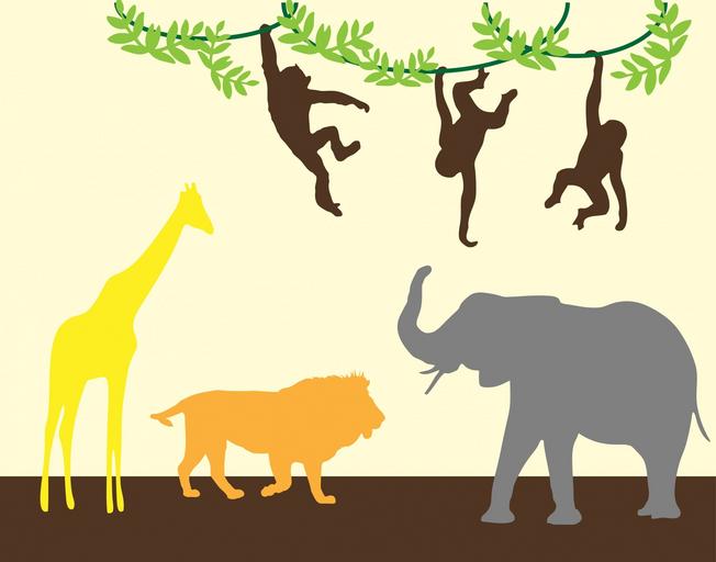 Keywords: animal animals jungle lion elephant giraffe monkeys monkey cute art silhouette silhouettes colorful bright shapes outlines wildlife