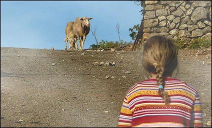 Keywords: animal animals sheep steinig two girl child plait away encounter stone wall sky blue sweater stripes holiday travel human summer walk