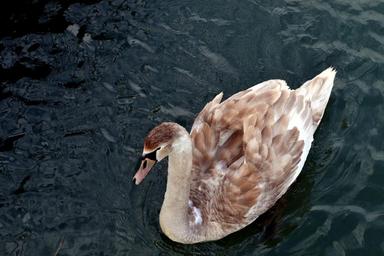 Keywords: animal bird swan young hatchling brown feathers swimming above elegant