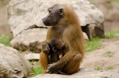 Keywords: animals baboons brown close-up couple day daytime guinea horizontal laying ledge mammals nobody outdoors outside pair primates rocks sitting together two wild wildlife