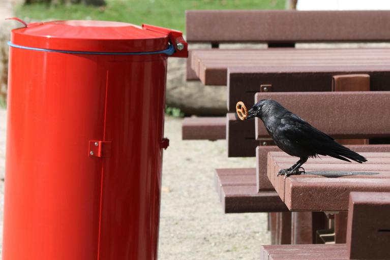 Keywords: animals birds jackdaw nature bill eat pretzel dig civilization black red dustbin waste bins