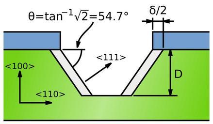 Keywords: Anisotropic wet etching.svg A diagram showing anisotropic wet etching in silicon showing the undercut under the resist The etch rate in the <111> direction is much slower about 100× slower than in the <100> direction own 2010-05-14 Inductiveload Etching microfabrication |