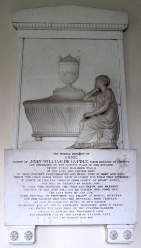 | Keywords: AnneDeLaPole ShuteChurch Devon.jpg en 1832 mural monument to Lady Anne Pole nee Templer 1758-1832 wife of Sir John de la Pole 6th Baronet 1757-1799 signed P Rouw sculp London Peter Rouw 1771-1852 west wall of south transept of St Michael's Church Shute Devon Inscription The mortal remains of Anne widow of John William de la Pole sixth baronet in descent are consigned to the resting place of her kindred within these hallowed walls in the sure and certain hope of that perfect consummation and bliss both in body and soul which the Lord Jesus Christ hath prepared for them that love him If purity of life can proceed from purity of heart alone she will be blessed in seeing God If they who consider the poor and needy are blessed the face of the Lord will not be turned away from her The last days of her life were devoted to smoothing the pillow of mortal sickness for her beloved brother the Reverend John Templer He died at Lindridge House in this county on Sunday the 5th day of February MDCCCXXXII aged 81 years and under the same roof on the ensuing Sabbath unable to endure her irreparable loss she followed him to the land of eternal rest in the 74th year of her age own photo own photo 1832; photo Sept 2012 Wall mounted church monuments in Devon New Shute House Peter Rouw |