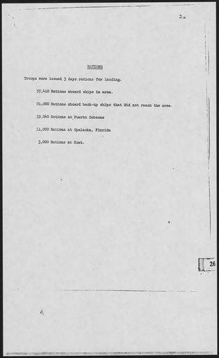 | Keywords: Annex No. 26 Rations - NARA - 193269.tif Scope and content Supplemental material used in Maxwell Taylor's report on the Bay of Pigs operation General notes 193269 Local identifier President 1961-1963 Kennedy Office of the Special Assistant to the President for National Security Affairs 01/20/1961 - 11/22/1963 NARA-Place Cuba North and Central America nation 4186389 21 5 -80 <br /> John F Kennedy Library NLJFK Columbia Point Boston MA 02125-3398 Record group Collection JFK-NSF Papers of President Kennedy National Security Files 01/20/1961 - 11/22/1963 Record group ARC 1164 Papers of President Kennedy National Security Files Countries compiled 01/20/1961 - 11/22/1963 Series ARC 193236 File unit Papers of President Kennedy National Security Files Countries Cuba Subjects Paramilitary Study Group Taylor Report 04/1961 - 07/1961 File unit ARC 193237 Variant control numbers NAIL Control Number NLK-NSF-CNTRYS-CUBASUBPSRTRANX-4DDDX yes Other versions NARA-cooperation PD-USGov Check categories-NARA 2011 September 13 Bay of Pigs Invasion Documents in English |