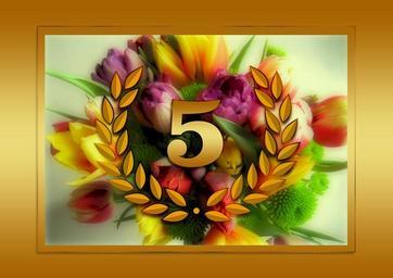 Keywords: anniversary great day day of remembrance commemorate bouquet of flowers gold celebration 5 five luck greeting greeting card map laurel wreath laurels leaves novel crown greek olympic honor wreath award winner victory yellow