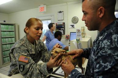 Keywords: Annual checkup 130417-N-TC587-010.jpg en Sgt Bethzabe Delgado noncommissioned officer in charge of Naval Station Mayport's Veterinary Clinic gives Electronics Technician 3rd Class Juan Serret's dog an ear infection check during an annual checkup The Mayport Clinic helps take care of military working dogs on the base and minor issues with pets for active duty and retired service members U S Navy photo by Mass Communication Specialist 3rd Class Damian Berg/Released 2013-04-17 Petty Officer 3rd Class Damian Berg https //www dvidshub net/image/910782 130417-N-TC587-010 2013-04-19 18 31 MAYPORT FLA FL US PD-USGov-Military-Navy Naval Station Mayport Images from DoD uploaded by Fæ |