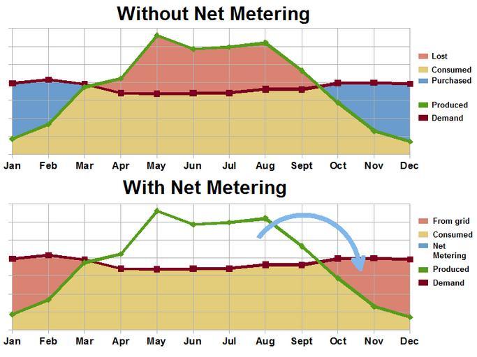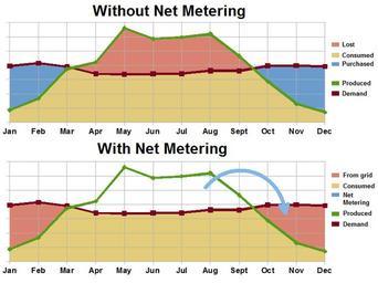 Keywords: Annual Net Metering.png en Net metering is used on an annual basis to allow solar power generated during the summer to be used during the winter The meter runs backwards on sunny days and runs forward each night The consumer only pays for the net difference left over each month During summer months there is a surplus each month which is carried over until the fall and winter when it is consumed By spring it all equals out There are no monthly energy payments all year because the kilowatt hour credits generated during the summer are used during the winter The only charges are a connection fee to use the grid 2013-06-08 own Delphi234 cc-zero Uploaded with UploadWizard Photovoltaics |