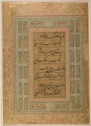 | Keywords: Anonymous Arabic and Persian Poetic Verses WDL6796.png Artwork ru Поэтические ст офы на а абском и пе сидском языках неизвестного авто а fr Vers poétiques anonymes en arabe et en persan en Anonymous Arabic and Persian Poetic Verses zh 匿名的阿拉伯文和波斯文诗篇 pt Versículos Anônimos Poéticos Árabes e Persas ar أبيات شعرية عربية وفارسية مجهولة الهوية ru а этом ф агменте п едставлены восьмистишие на а абском языке в цент альном панно и поэтические ст офы на пе сидском языке в небольших п ямоугольных вставках асположенных вок уг цент ального панно на светло-голубом фоне В стихотво ении на а абском гово ится о возможности ухаммеда заступиться за своих ве ующих в Судный день Это своего ода хвала или п осьба об ащенная к П о оку кото ая вст ечается в яде д угих каллиг афических панно кото ые вывешивали для всеобщего обоз ения или вставляли в альбомы по каллиг афии Стихи на а абском и пе сидском языках написаны письмом насталик также известным как талик в Ту ции и фа си в а абских ст анах Те мин насталик полученный объединением слов насх наклонный и талик висящий обозначает сочетание двух ш ифтов кото ое п едположительно было изоб етено в 14-ом веке пе сидским каллиг афом и -Али Таб изи Этот ф агмент возможно был создан в Пе сии в 16-ом веке Цент альная часть каллиг афического панно офо млена на ко ичневой бумаге п исыпанной мелкой золотой пылью с пятью почти квад атными лепестками сусального золота Каллиг афические ст оки азделены золотыми линиями в че ном об амлении кото ые об азуют п ямоугольные амки для стихов на а абском языке Вок уг цент ального панно нанесена озовая амка с цветочным о наментом выполненным золотом и светло-би юзовая кайма на кото ой азмещены 28 вставок со стихами на пе сидском языке об амленных узо ом из золотых вьющихся ветвей Эти каллиг афические панно наклеены на желтовато-ко ичневую многослойную бумагу ук ашенную на исованными золотом цветами птицами и астениями <br>А абская каллиг афия; А абская поэзия; Иллюмини ование укописей; Исламская каллиг афия; Исламские укописи; Судный день fr Ce fragment contient un poème arabe de huit vers dans le panneau central et des vers poétiques persans dans de petits registres rectangulaires disposés autour du panneau central et collés sur un fond bleu clair Le poème arabe insiste sur la capacité de Mahomet à intervenir en faveur de sa communauté le jour du Jugement dernier Il s'agit d'une sorte de requête ou d'éloge adressé au prophète qui apparaît sur de nombreux panneaux calligraphiques différents destinés à un affichage public ou insérés dans des albums de calligraphie Les vers arabes et persans sont écrits en style nasta'liq aussi appelé ta'liq en turc et farsi en terre arabe Le terme nasta'liq qui associe naskh cursive et ta'liq suspendu fait référence à un mélange des deux styles qui aurait été inventé par le calligraphe persan du XIV<sup>e</sup> siècle Mir 'Ali Tabrizi Ce fragment a peut-être été produit en Perse au XVI<sup>e</sup> siècle La feuille centrale de calligraphie est constituée de papier brun parsemé de poussière d'or fin et comporte cinq carrés grossiers dorés à la feuille Les panneaux calligraphiques sont séparés par des lignes dorées bordées de noir formant des cadres rectangulaires pour les vers arabes Autour du panneau central se trouve une bordure rose comportant des motifs floraux exécutés à l'or avec une bordure bleu clair où figurent les 28 panneaux de vers persans entrelacés de motifs dorés de vigne Ces planches calligraphiques sont toutes collées sur un papier contrecollé coloré décoré de fleurs d'oiseaux et de plantes peints à l'or <br>Calligraphie arabe; Poésie arabe; Enluminures; Calligraphie islamique; Manuscrits islamiques; Jour du Jugement dernier en This fragment contains an Arabic poem in eight verses in the center panel and Persian poetical verses in small rectangular registers arranged around the central panel and pasted above a light blue background The Arabic poem stresses Muhammad s ability to provide intercession for his community on the Day of Judgment It is a kind of praise or request directed towards the Prophet that is seen in a number of other calligraphic panels meant either for public display or included in albums of calligraphies The Arabic and Persian verses are executed in nasta'liq script also known as ta'liq in Turkey and Farsi in Arab lands The term nasta'liq which combines naskh cursive and ta'liq hanging refers to a blend of the two scripts believed to hav