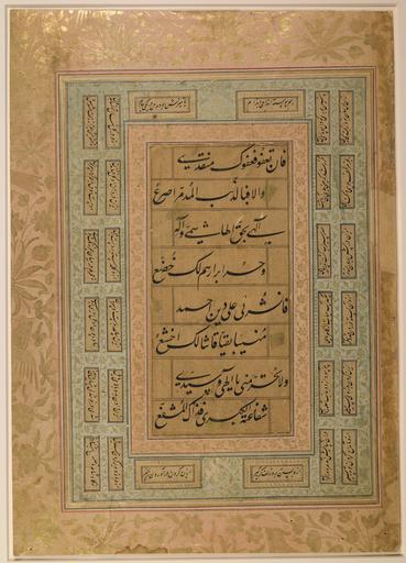 Keywords: Anonymous Arabic and Persian Poetic Verses WDL6796.png Artwork ru Поэтические ст офы на а абском и пе сидском языках неизвестного авто а fr Vers poétiques anonymes en arabe et en persan en Anonymous Arabic and Persian Poetic Verses zh 匿名的阿拉伯文和波斯文诗篇 pt Versículos Anônimos Poéticos Árabes e Persas ar أبيات شعرية عربية وفارسية مجهولة الهوية ru а этом ф агменте п едставлены восьмистишие на а абском языке в цент альном панно и поэтические ст офы на пе сидском языке в небольших п ямоугольных вставках асположенных вок уг цент ального панно на светло-голубом фоне В стихотво ении на а абском гово ится о возможности ухаммеда заступиться за своих ве ующих в Судный день Это своего ода хвала или п осьба об ащенная к П о оку кото ая вст ечается в яде д угих каллиг афических панно кото ые вывешивали для всеобщего обоз ения или вставляли в альбомы по каллиг афии Стихи на а абском и пе сидском языках написаны письмом насталик также известным как талик в Ту ции и фа си в а абских ст анах Те мин насталик полученный объединением слов насх наклонный и талик висящий обозначает сочетание двух ш ифтов кото ое п едположительно было изоб етено в 14-ом веке пе сидским каллиг афом и -Али Таб изи Этот ф агмент возможно был создан в Пе сии в 16-ом веке Цент альная часть каллиг афического панно офо млена на ко ичневой бумаге п исыпанной мелкой золотой пылью с пятью почти квад атными лепестками сусального золота Каллиг афические ст оки азделены золотыми линиями в че ном об амлении кото ые об азуют п ямоугольные амки для стихов на а абском языке Вок уг цент ального панно нанесена озовая амка с цветочным о наментом выполненным золотом и светло-би юзовая кайма на кото ой азмещены 28 вставок со стихами на пе сидском языке об амленных узо ом из золотых вьющихся ветвей Эти каллиг афические панно наклеены на желтовато-ко ичневую многослойную бумагу ук ашенную на исованными золотом цветами птицами и астениями <br>А абская каллиг афия; А абская поэзия; Иллюмини ование укописей; Исламская каллиг афия; Исламские укописи; Судный день fr Ce fragment contient un poème arabe de huit vers dans le panneau central et des vers poétiques persans dans de petits registres rectangulaires disposés autour du panneau central et collés sur un fond bleu clair Le poème arabe insiste sur la capacité de Mahomet à intervenir en faveur de sa communauté le jour du Jugement dernier Il s'agit d'une sorte de requête ou d'éloge adressé au prophète qui apparaît sur de nombreux panneaux calligraphiques différents destinés à un affichage public ou insérés dans des albums de calligraphie Les vers arabes et persans sont écrits en style nasta'liq aussi appelé ta'liq en turc et farsi en terre arabe Le terme nasta'liq qui associe naskh cursive et ta'liq suspendu fait référence à un mélange des deux styles qui aurait été inventé par le calligraphe persan du XIV<sup>e</sup> siècle Mir 'Ali Tabrizi Ce fragment a peut-être été produit en Perse au XVI<sup>e</sup> siècle La feuille centrale de calligraphie est constituée de papier brun parsemé de poussière d'or fin et comporte cinq carrés grossiers dorés à la feuille Les panneaux calligraphiques sont séparés par des lignes dorées bordées de noir formant des cadres rectangulaires pour les vers arabes Autour du panneau central se trouve une bordure rose comportant des motifs floraux exécutés à l'or avec une bordure bleu clair où figurent les 28 panneaux de vers persans entrelacés de motifs dorés de vigne Ces planches calligraphiques sont toutes collées sur un papier contrecollé coloré décoré de fleurs d'oiseaux et de plantes peints à l'or <br>Calligraphie arabe; Poésie arabe; Enluminures; Calligraphie islamique; Manuscrits islamiques; Jour du Jugement dernier en This fragment contains an Arabic poem in eight verses in the center panel and Persian poetical verses in small rectangular registers arranged around the central panel and pasted above a light blue background The Arabic poem stresses Muhammad s ability to provide intercession for his community on the Day of Judgment It is a kind of praise or request directed towards the Prophet that is seen in a number of other calligraphic panels meant either for public display or included in albums of calligraphies The Arabic and Persian verses are executed in nasta'liq script also known as ta'liq in Turkey and Farsi in Arab lands The term nasta'liq which combines naskh cursive and ta'liq hanging refers to a blend of the two scripts believed to have 