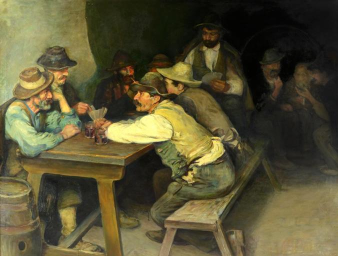 | Keywords: Anonymous - Gamblers (c. 1900).jpg Artwork Creator Anonymous langSwitch Jarní krajina s rozkvetlou jabloní hochem hrajícím na Panovu flétnu a sedící dívkou s motýlem na natažené ruce Genreszene aus Kneipe im Vordergrund Männergruppe beim Kartenspielen hinten drei rauchende Männer vor großem Weinfass Genre scene from the pub Group of men are playing cards on their right side are three other men smoking in front of a large wine barrel 1900 oil canvas cm 144 186 5 object history credit line accession number LangSwitch http //www papilio cz/cz/archiv php aukce a40 pol 16377 Aukční dům Zezula http //www papilio cz/de/archiv php aukce a40 pol 16377 Auktionshaus Zezula Brno http //www papilio cz/en/archiv php aukce a40 pol 16377 Auction house Zezula Brno PD-art-100 Gamblers |