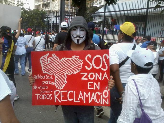 Keywords: Anonymous protester Venezuelan protests 2014.jpg en A protester wearing an Anonymous mask The sign says SOS Zone in Reclamation Freedom peace Venezuela is everyone es Un protestante llevando una máscara de Anonymous SOS Zona en reclamación Libertad paz Venezuela somos todos 2014-03-02 14 26 02 own Jamez42 cc-zero Uploaded with UploadWizard Demonstrations and protests opposing Bolivarian Revolution Demonstrations and protests in Venezuela in 2014 |