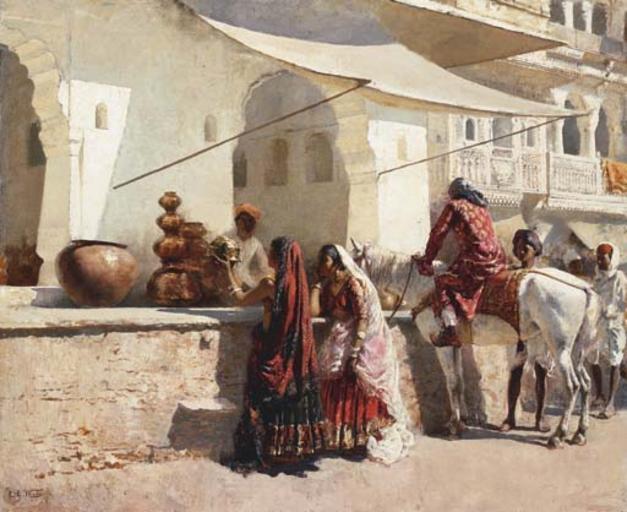 | Keywords: Another Rajasthani street scene by Edwin Lord Weeks.jpg en Another Rajasthani street scene by Edwin Lord Weeks 1887 probably in Udaipur Source http //www christies com/LotFinder/search/LotDetail asp sid highlights 3Cspan+class 3D 27esn 5Fsegment 27+title 3D 27 2FLotCommon 2FCatalogueEntry 27 3E 0AA+Street+Market+Scene 2C+ 3Cb 3E 3Cspan+class 3D 27esn 5Fhighlight 27 3EIndia 3C 2Fspan 3E 3C 2Fb 3E+ 26lt 3BBR 3C 2Fspan 3E+ 2E 2E 2E intObjectID 4800778 AllObjectIDs 4803582 4803587 4801548 4802265 4793188 4800859 4800778 4799488 4799822 4801547 4801555 4801581 4801553 4801340 4801558 4801556 4801554 4801482 4801559 4801557 RefineQueryURL AdvancedSearch 2Easp 3Fsid 3D 26entry 3Dindia 26T 3DLot 26P 3D 26CF 3D 26SU 3D1 26RQ 3DFalse 26AN 3D1 downloaded Oct 2006 Edwin Lord Weeks American 1849-1903 A Street Market Scene India; signed 'E L Weeks' and stamped with his Mogul device lower left ; oil on canvas 23¾ x 29 in 60 5 x 74 cm Painted circa 1887 Lot Notes A Street Market Scene India is a fine example of Edwin Lord Week's quotidian street scenes of northern India In these paintings Weeks demonstrated his great skills in draftsmanship color and texture in his precise yet suggestive visual records of his Indian travels-the very ordinariness of the scene contrasting sharply with the beautiful forms rich colors and textures of the elements and actors depicted The scene is entirely characteristic of north Indian city streets in which the street is the promenade and a row of shops occupy a built-up platform beneath an arcade of windows and bracketed balconies In the present work the city depicted is probably Udaipur then Oudeypore as suggested by the elaborate windows and shallow balconies depicted at the right side of the painting and by the white plaster covering thebuilding walls In his travel journal from the Black Sea through Persia and India Weeks wrote of Udaipur as 'an endless expanse of white ' The painting was executed circa 1887 in two stages Initially the architectural backdrop of the picture would have been painted in situ; a plein air rendering of the physical context The second stage of the painting would have been executed either while still in India or more likely some time later in the artist's studio in Paris In this second 'campaign' the figures and animals would have been added to the painting based upon a multitude of such elements and poses Weeks had executed in India The present painting is highly finished suggesting it was completed in Week's Paris studio a metalsmith's shop in the shadowed background of white walls and delicately fashioned arched openings The whitewashed setting serves as an an almost neutral background off which the artist plays with great still-life of dancing color and reflections - from a large copper pot to copper and brass jugs and bowls stacked on high The pot in the woman's hands brilliantly reflects the sunlight in its brassy colors and reflections The figures too are brilliantly rendered with variegated silk and cotton embroidered costumes and flowing translucent white muslin The women's arms are covered in silver bracelets their ears in long silver earrings and their necks in goldnecklaces - all of which suggests they may be nautch dancers from the Court The women's bare midriffs unusual in more southern parts of India caught Weeks' attention at the time 'In all the north country costumes there is a wide gap between the bodice and the skirts and the wearer never seems anxious to conceal it' Weeks' letter to the president of the Pennsylvania Academy of Fine Art September 18 1883 The painting relates to and very favorably compares to other Weeks paintings of this genre including A Street Scene in the East National Collection of Fine Arts Smithsonian Institution The Soldier of the Rajah Coming to the Sword Sharpener of Ahmedabad Portland Museum of Art and A Street Scene in North West India probably Udaipur sold at Christie's London 24 September 2003 lot 86 This last work shows a Rajput in blue silk on a similar horse and two young women dressed exactly like the two women in the present painting though rendered in shade instead of the brilliant light of the present work A favorite device in many of these paintings is a Rajput noble atop or standing next to his elaborately-saddled horse turned towards the shop fronts engaged in studying items for sale or often seen in flirtations with young women dressed in a manner similar to the figures in the present painting all with comely faces or profiles We are grateful to D Ellen K Morris for providing the catalogue entry for this work This painting will be included in the catalogue raisonné being prepared by Dr Ellen K Morris 1887 http //www columbia edu/itc/mealac/pritchett/00routesdata/1800_1899/women/balconies/balconies html creator Edwin Lord Weeks PD-old-100 Historical images of Udaipur Paintings of India by Edwin Lord Weeks 19th-century orientalist paintings 19th-century paintings location missing |