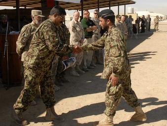 | Keywords: ANSF Graduate from Courses at RMTC DVIDS375435.jpg  en An Afghan National Army soldier receives his certificate for completing the Up Armored HMMWV course at Regional Military Training Center from Col Haroon the RMTC's Commanding Officer at RMTC in Kandahar Afghanistan The graduation ceremony was for student the completed the Up Armored HMMWV course Literacy course and Medic course from RMTC and the students were from the Afghan National Army Afghan Air Force Afghan Uniformed Police and Afghan National Civil Order of Police 2011-03-10 Petty Officer 2nd Class David Kolmel https //www dvidshub net/image/375435 110310-N-+++++-005 2011-03-10 06 43 REGIONAL MILITARY TRAINING CENTER AF PD-USGov-Military-Navy Soldiers of the Afghan National Army Images from DoD uploaded by Fæ |
