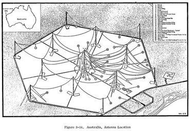 Keywords: Antenna location at the US Naval Communication Station Harold E. Holt in Exmouth, Western Australia, 1972.png Antenna location at the U S Naval Communication Station Harold E Holt in Exmouth Western Australia in 1972 This is a very low frequency VLF transmitter which communicates with submerged submarines This type of antenna is called a Trideco or umbrella antenna It consists of multiple steel masts which radiate radio waves with a network of cables attached to their tops The cables do not themselves radiate radio waves but serve as a capacitive top-load adding capacitance to the top of the antenna to make it more efficient On the ground under the antenna there is an elaborate ground system called a counterpoise consisting of radial cables in a star shape suspended a few feet above the ground NAVELEX 0101 113 Fig 3-14 1972 US Navy Naval Electronics Systems Command PD-USGov-Military-Navy Original upload log en wikipedia NAVELEX0101-113 2CFig3-14 png wikitable - 2011-04-01 17 26 1379×954× 320560 bytes Mcg410 <nowiki> Diagram of Antennas at NCS Harold E Holt NAVELEX 0101 113 Fig 3-14 1972 US Navy Naval Electronics Systems Command </nowiki> U S Naval Communication Station Harold E Holt Exmouth Western Australia |