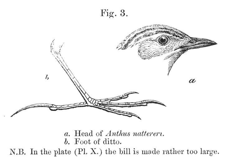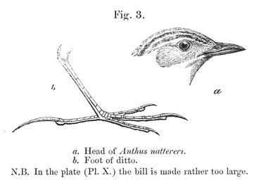 Keywords: Anthus nattereri head and foot.jpg « Anthus nattereri » Anthus nattereri Ochre-breasted Pipit - head and foot « Anthus nattereri » Anthus nattereri Pipit ocré - tête et patte http //archive org/stream/ibis24brit page/366/mode/2up The Ibis ser 4 vol 2 creator Philip Lutley Sclater 1878 PD-old-100 Anthus nattereri Ibis 1878 Passeriformes feet Motacillidae anatomy |