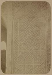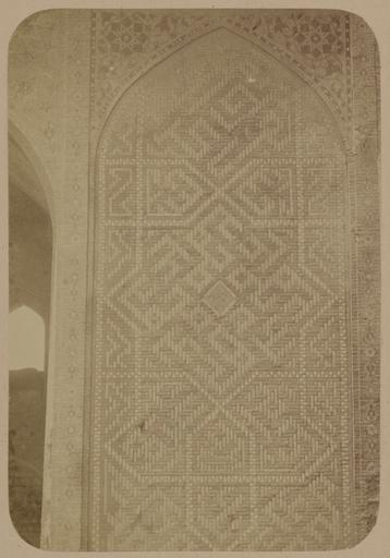 Keywords: Antiquities of Samarkand. Madrasah of Bibi Khanym. Congregational Mosque WDL3758.png Artwork ru Богаевский иколай Владими ович 1843 1912 гг fr Bogaevskii Nikolaï V 1843-1912 en Bogaevskii Nikolai V 1843-1912 zh 亚历山大·L· ,1840-1888 年 pt Bogaevskii Nikolai V 1843-1912 ar بوغافسكي، نيكولاي ف ، 1843-1912 es Bogaevskii Nikolai V 1843-1912 ru Сама кандские д евности ед есе Биби Ханым Собо ная мечеть fr Antiquités de Samarcande Madrasa de Bibi Khanym Mosquée de congrégation en Antiquities of Samarkand Madrasah of Bibi Khanym Congregational Mosque zh 撒马尔罕古迹 比比·哈努姆伊斯兰教学校 公理会清 寺 pt Antiguidades de Samarcanda Madrassa de Bibi Khanym Mesquita congregacional ar آثار سمرقند مدرسة بيبي خانوم المسجد الجامِع ru Эта фотог афия ке амической панели фасада главной мечети ансамбля Биби Ханым в Сама канде Узбекистан соде жится в а хеологической части <em> Ту кестанского альбома </em> Шеститомное фотог афическое исследование было п оведено в 1871 1872 гг под уководством гене ала Константина П фон Кауфмана пе вого гене ал-губе нато а 1867 1882 гг Ту кестана как называли те ито ию Цент альной Азии п инадлежавшую Российской импе ии В альбоме уделяется особое внимание исламской а хитекту е Сама канда в том числе памятникам XIV и XV вв пе иода п авления Тиму а Таме лана и его п еемников Пост оенный в 1399 1405 гг с использованием т офеев индийской кампании Тиму а ансамбль Биби Ханым был местом асположения главной или пятничной мечети го ода названной в честь ста шей жены Тиму а Са ай ульк Ханым ечеть находящаяся в цент е ансамбля является одной из к упнейших в исламском ми е Вследствие асположения в активной сейсмической зоне как и всем ст оениям в ансамбле мечети был нанесен се ьезный уще б Здесь показана ке амическая панель ве хнего п авого угла фасада асположенная в п еделах ог омной а ки входа <em>iwan</em> сводчатый зал с одним отк ытым концом ок уженный с т ех сто он стенами Здесь показана се ия ке амических ук ашений включающая в себя сложные геомет ические фигу ы пок ытые куфическим письмом а также деко ативные ве тикальные полосы с геомет ическими и цветочными узо ами Слева видна <em>peshtak</em> а ка фасада над по талом ведущим в куполооб азную внут еннюю часть <br>А хитекту ные ук ашения и деко ативные элементы; Исламская а хитекту а; ина еты; ечети; Фотог афические исследования fr Cette photographie d'un panneau de céramique sur la façade de la mosquée principale de l'ensemble de Bibi Khanym à Samarcande Ouzbékistan est extraite de l'ouvrage archéologique <em>Album du Turkestan</em> Cet inventaire photographique en six volumes fut réalisé entre 1871 et 1872 sous le patronage du général Konstantin P von Kaufman premier gouverneur général 1867-1882 du Turkestan nom donné aux territoires d'Asie centrale de l'Empire russe L'album consacre une attention particulière à l'architecture islamique de Samarcande avec notamment des monuments datant des XIV<sup>e</sup> et XV<sup>e</sup> siècles lors du règne de Tamerlan et de ses successeurs Construit entre 1399 et 1405 avec le butin de la campagne de Tamerlan en Inde l'ensemble de Bibi Khanym était l'emplacement de la mosquée principale de la ville ou Mosquée du Vendredi nommée en hommage à la première épouse de Tamerlan Sarai Mulk Khanym La vaste structure de la mosquée une des plus grandes du monde islamique se trouve au centre de l'ensemble l'instar de toutes les structures de l'ensemble la mosquée a subi des dommages considérables dus à l'activité sismique de cette région Cette vue montre un panneau de céramique sur la partie supérieure droite de la façade situé dans le grand arceau de l'<em>aivan</em> salle voûtée dotée de trois murs et d'un côté ouvert de l'entrée De multiples ornements en céramique notamment des figures géométriques complexes comportant une écriture kufique angulaire et des bandes verticales décoratives de motifs géométriques et à fleurs sont illustrés ici Le <em>peshtak</em> arceau de façade est visible à gauche au-dessus du portail menant vers l'intérieur voûté <br>Décorations et ornements architecturaux; Architecture islamique; Minarets; Mosquées; Inventaires photographiques en This photograph of a ceramic panel on the facade of the main mosque at the Bibi Khanym ensemble in Samarkand Uzbekistan is from the archeological part of <em>Turkestan Album</em> The six-volume photographic survey was produced in 1871-72 under the patronage of General Konstantin P von Kaufman the first governor-general 1867-82 of Turkestan as the Russian Empire s Central Asian territo
