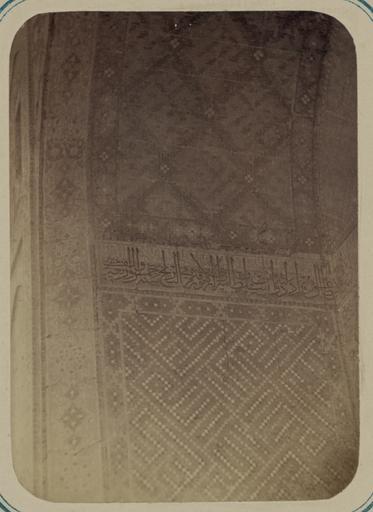 | Keywords: Antiquities of Samarkand. Madrasah of Nadir Divan-Begi, Congregational Mosque (Friday Mosque). End WDL3785.png Artwork ru Богаевский иколай Владими ович 1843 1912 гг fr Bogaevskii Nikolaï V 1843-1912 en Bogaevskii Nikolai V 1843-1912 zh 亚历山大·L· ,1840-1888 年 pt Bogaevskii Nikolai V 1843-1912 ar بوغافسكي، نيكولاي ف ، 1843-1912 es Bogaevskii Nikolai V 1843-1912 ru Сама кандские д евности ед есе ади Диван-Беги собо ная мечеть мечеть джами Конец fr Antiquités de Samarcande Madrasa de Nadir Divan-Begi mosquée de congrégation mosquée du Vendredi Fin en Antiquities of Samarkand Madrasah of Nadir Divan-Begi Congregational Mosque Friday Mosque End zh 撒马尔罕古迹 纳迪尔·迪万- 吉伊斯兰教学校,大清 寺(星 五清 寺) 结 部分 pt Antiguidades de Samarcanda Madrassa de Nadir Divan-Begi mesquita congregacional mesquita de sexta-feira Fim ar آثار سمرقند مدرسة نذير ديفان بيغي، المسجد الجامع مسجِد الجُمعة النهاية ru Эта фотог афия мечети в мед есе ади Диван-Беги в Сама канде Узбекистан соде жится в а хеологической части <em> Ту кестанского альбома </em> Шеститомное фотог афическое исследование было подготовлено и издано в 1871 1872 гг под пат онажем гене ала Константина П фон Кауфмана пе вого гене ал-губе нато а 1867 1882 гг Ту кестана как называли в то в емя те ито ию Цент альной Азии п инадлежавшую Российской импе ии В альбоме уделяется особое внимание исламскому а хитекту ному наследию Сама канда Эта <em>мед есе</em> елигиозная школа асположенная ядом с усыпальницей Ходжа Ах а была пост оена в 1631 г ади ом Диван-Беги визи ем буха ского п авителя Имам-Кули Хана ед есе была заплани ована в виде п ямоугольного дво а с мечетью на одной из сто он онументальная а ка <em>айвана</em> сводчатого зала с одним отк ытым концом ок уженного с т ех сто он стенами находится в цент е главного фасада мечети а этом снимке показана ве хняя часть левого к ыла ниши об азованной ог омной а кой а пове хности стены видны геомет ические узо ы из плитки кото ые соде жат цветочные мотивы и куфические буквы об азующие слова из калимы основы шахады или исламской декла ации ве ы Го изонтальная ке амическая надпись пе сидско-а абским письмом тянется че ез всю стену по линии откуда к ыло ниши зак угляется внут ь и об азует а ку айвана ад надписью снова изоб ажен искусный геомет ический узо Сп ава видна задняя стена ниши а слева внешняя стена айвана <br>А хитекту ные ук ашения и деко ативные элементы; Исламская а хитекту а; ечети; Фотог афические исследования fr Cette photographie de la mosquée de la madrasa de Nadir Divan-Begi à Samarcande Ouzbékistan est extraite de l'ouvrage archéologique <em>Album du Turkestan</em> Cet inventaire photographique en six volumes fut réalisé entre 1871 et 1872 sous le patronage du général Konstantin P von Kaufman premier gouverneur général 1867-1882 du Turkestan nom donné aux territoires d'Asie centrale de l'Empire russe L'album consacre une attention particulière à l'héritage de l'architecture islamique de Samarcande Jouxtant le sanctuaire de Khodzha Akhrar cette <em>madrasa</em> école religieuse fut achevée en 1631 sous Nadir Divan-Begi vizir du souverain de Boukhara Imam-Quli Khan Elle fut conçue comme une cour rectangulaire avec une mosquée à une extrémité L'arceau monumental de l'<em>aivan </em> salle voûtée dotée de trois murs et d'un côté ouvert se situe au centre de la façade principale de la mosquée Cette vue présente la partie supérieure du flanc gauche à l'intérieur de la niche formée par le grand arceau La surface du mur est composée de motifs de carreaux géométriques qui incluent des éléments à fleurs et des lettres kufiques angulaires écrivant des mots de la kalima fondement de la chahada et profession de foi islamique Une inscription horizontale de céramique en écriture perso-arabe parcourt le mur à l'endroit où le flanc de la niche commence sa courbe vers l'arceau de l'aivan Les motifs géométriques complexes sont repris au-dessus de l'inscription Le mur du fond de la niche est visible sur la droite et le mur extérieur de l'aivan apparaît sur la gauche <br>Décorations et ornements architecturaux; Architecture islamique; Mosquées; Inventaires photographiques en This photograph of the mosque at the Nadir Divan-Begi Madrasah in Samarkand Uzbekistan is from the archeological part of <em>Turkestan Album</em> The six-volume photographic survey was produced in 1871-72 under the patronage of General Konstantin P von Kaufman the first governor-general 1867-82 of Turkestan as the Russian Empire s Central Asian territories were called The al