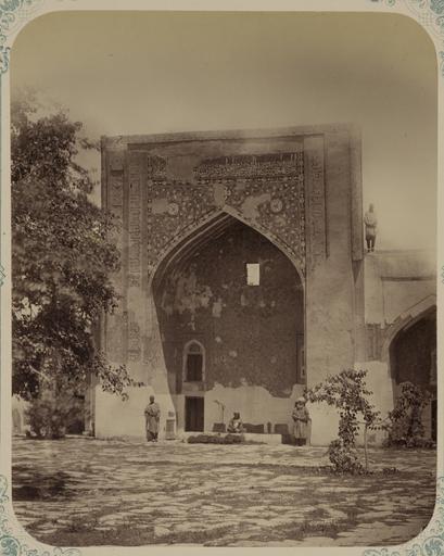 Keywords: Antiquities of Samarkand. Madrasah of Tillia Kari. Inner Courtyard (Northern Side). View of the Large Middle Niche WDL3813.png Artwork ru Богаевский иколай Владими ович 1843 1912 гг fr Bogaevskii Nikolaï V 1843-1912 en Bogaevskii Nikolai V 1843-1912 zh 亚历山大·L· ,1840-1888 年 pt Bogaevskii Nikolai V 1843-1912 ar بوغافسكي، نيكولاي ف ، 1843-1912 es Bogaevskii Nikolai V 1843-1912 ru Сама кандские д евности ед есе Тилля-Ка и Внут енний дво севе ная сто она Вид на большую с еднюю нишу fr Antiquités de Samarcande Madrasa de Tillia Kari Cour intérieure côté nord Vue de la grande niche centrale en Antiquities of Samarkand Madrasah of Tillia Kari Inner Courtyard Northern Side View of the Large Middle Niche zh 撒马尔罕古迹 季里雅·卡利伊斯兰教学校 内部庭院(北侧) 大型中间壁龛 pt Antiguidades de Samarcanda Madrassa de Tillia Kari Pátio interno lado norte Vista do grande nicho intermediário ar آثار سمرقند مدرسة تِلْيَا كَرِى الفناء الداخلي الجانب الشمالي منظر للمشكاة الوسطى الكبيرة ru Эта фотог афия севе ной стены дво а в мед есе Тилля-Ка и в Сама канде Узбекистан соде жится в а хеологической части <em> Ту кестанского альбома </em> Шеститомное фотог афическое исследование было подготовлено и издано в 1871 1872 гг под пат онажем гене ала Константина П фон Кауфмана пе вого гене ал-губе нато а 1867 1882 гг Ту кестана как называли в то в емя те ито ию Цент альной Азии п инадлежавшую Российской импе ии В альбоме уделяется особое внимание исламской а хитекту е Сама канда в том числе памятникам XIV и XV вв пе иода п авления Тиму а Таме лана и его п еемников В цент е Сама канда находится ансамбль Регистан объединяющий в себе т и основных об азца <em>madrasah</em> мед есе елигиозных школ Т етья часть Регистана мед есе Тилля-Ка и была пост оена в 1646 1660 гг на месте бывшего ка аван-са ая Здесь показана а ка <em>айвана</em> сводчатого зала с одним отк ытым концом ок уженного с т ех сто он стенами в цент е севе ной стены дво а есмот я на значительные пов еждения в ве хней части фасада видны остатки пе воначальных многоцветных ке амических ук ашений О наменты включают сложные геомет ические фигу ы а также ботанические мотивы Большая а ка заканчивается изогнутым сводом состоящим из висящих сталактитовых ке амических деталей в стиле <em>mocárabe</em> сотовая ст укту а По сто онам а ка об амлена ве тикальными полосами с надписями а по ве ху фасада сделана го изонтальная надпись в изысканном укописном стиле С обеих сто он а ки асположена одноэтажная к ытая гале ея с комнатами для ученых <br>Дво ы; Исламская а хитекту а; ед есе; иши; Фотог афические исследования fr Cette photographie du mur nord de la cour de la madrasa de Tillia Kari à Samarcande Ouzbékistan est extraite de l'ouvrage archéologique <em>Album du Turkestan</em> Cet inventaire photographique en six volumes fut réalisé entre 1871 et 1872 sous le patronage du général Konstantin P von Kaufman premier gouverneur général 1867-1882 du Turkestan nom donné aux territoires d'Asie centrale de l'Empire russe L'album consacre une attention particulière à l'architecture islamique de Samarcande avec notamment des monuments datant des XIV<sup>e</sup> et XV<sup>e</sup> siècles lors du règne de Tamerlan et de ses successeurs Situé au centre de Samarcande l'ensemble du Registan est composé de trois exemples majeurs de <em>madrasa</em> école religieuse Le troisième composant du Registan la madrasa de Tillia Kari fut construit entre 1646 et 1660 sur le site d'un ancien caravansérail Cette vue présente l'arceau de l'<em>aivan</em> salle voûtée dotée de trois murs et d'un côté ouvert au centre du mur nord de la cour Malgré des dommages considérables la partie supérieure de la façade arbore encore les vestiges des ornements en céramique polychrome d'origine Les décorations incluent des figures géométriques complexes et des motifs à fleurs Le grand arceau est surplombé d'une voûte décorée d'éléments en céramique qui semblent être suspendus appelés <em>mocarabe</em> ou « stalactites » Il est encadré de bandes d'inscription verticales tandis que la partie supérieure de la façade est marquée par une inscription horizontale en style cursif sophistiqué Une arcade à un étage contenant des salles réservées aux érudits s'étend des deux côtés de la structure de l'arceau <br>Cours; Architecture islamique; Madrasas; Niches; Inventaires photographiques en This photograph of the north wall of the courtyard of the Tillia Kari Madrasah in Samarkand Uzbekistan is from the archeological 
