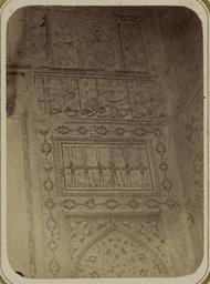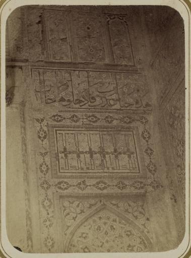 Keywords: Antiquities of Samarkand. Mausoleum of the Emir Timur Kuragan (Gur-Emir). Inscription along the Sides and inside the Main Entry Niche WDL3724.png Artwork ru Богаевский иколай Владими ович 1843 1912 гг fr Bogaevskii Nikolaï V 1843-1912 en Bogaevskii Nikolai V 1843-1912 zh 亚历山大·L· ,1840-1888 年 pt Bogaevskii Nikolai V 1843-1912 ar بوغافسكي، نيكولاي ف ، 1843-1912 es Bogaevskii Nikolai V 1843-1912 ru Сама кандские д евности авзолей эми а Тиму а Ку агана Гу -Эми адписи по сто онам и внут и главной входной ниши fr Antiquités de Samarcande Mausolée de l'émir Timour Kuragan Gour Emir Inscription le long des côtés et à l'intérieur de la niche de l'entrée principale en Antiquities of Samarkand Mausoleum of the Emir Timur Kuragan Gur-Emir Inscription along the Sides and inside the Main Entry Niche zh 撒马尔罕古迹 埃米尔帖 儿·库拉甘的陵墓(古尔-埃米尔) 主入口壁龛外侧与内侧的铭文 pt Antiguidades de Samarcanda Mausoléu de Tamerlão Gur-Emir Inscrição nas laterais e dentro do nicho da entrada principal ar آثار سمرقند ضريح الأمير تيمور كوراغان گورِ أمير نقش بطول الجانبين وداخل مِشْكاة المدخل الرئيسي ru Эта фотог афия детали главной входной а ки во дво мавзолея Гу -Эми в Сама канде Узбекистан соде жится в а хеологической части <em> Ту кестанского альбома </em> Шеститомное фотог афическое исследование было подготовлено и издано в 1871 1872 гг под пат онажем гене ала Константина П фон Кауфмана пе вого гене ал-губе нато а 1867 1882 гг Ту кестана как называли в то в емя те ито ию Цент альной Азии п инадлежавшую Российской импе ии В альбоме уделяется особое внимание исламскому а хитекту ному наследию Сама канда включая Гу -Эми на пе сидском языке означает г обница повелителя Гу -Эми известен в пе вую оче едь как место захо онения Тиму а Таме лана хотя Тиму начал его ст оительство еще в 1403 г в память своего любимого внука ухаммада Султана уме шего в воз асте 27 лет После похо он Тиму а в 1405 г Гу -Эми стал мавзолеем Тиму идов а фотог афии видно левое к ыло а ки входной ниши <em>айвана</em> сводчатый зал с одним отк ытым концом ок уженный с т ех сто он стенами Хотя фасад пост адал здесь п едставлены азнооб азные многоцветные ке амические ук ашения асположенные на четы ех у овнях Панель ст ельчатой а ки в нижней части соде жит цветочные мотивы внут и сложного геомет ического узо а а панели над ней изоб ажена деко ативная сетка с цветочными элементами а следующей панели видна пе сидско-а абская надпись удлиненным письмом пе емежающаяся с цветочными узо ами а ве хнем у овне находится го изонтальная полоса из фаянсовых сегментов с лучистыми цветочными фигу ами <br>А хитекту ные ук ашения и деко ативные элементы; адписи; Исламская а хитекту а; Фотог афические исследования; огильные памятники; Тиму 1336-1405 гг ; Г обницы fr Cette photographie des détails de l'arceau de l'entrée principale menant vers la cour du mausolée de Gour Emir à Samarcande Ouzbékistan est extraite de l'ouvrage archéologique <em>Album du Turkestan</em> Cet inventaire photographique en six volumes fut réalisé entre 1871 et 1872 sous le patronage du général Konstantin P von Kaufman premier gouverneur général 1867-1882 du Turkestan nom donné aux territoires d'Asie centrale de l'Empire russe L'album consacre une attention particulière à l'héritage de l'architecture islamique de Samarcande notamment Gour Emir « tombe du souverain » en persan Bien qu'il soit principalement connu comme le lieu de sépulture de Tamerlan Gour Emir fut commencé sous Tamerlan en 1403 pour commémorer la mort de son petit-fils bien-aimé le sultan Mahomet à l'âge de 27 ans Lorsque Tamerlan y fut enterré en 1405 Gour Emir devint le mausolée des Timourides Cette vue présente le flanc gauche de la niche située dans l'arceau de l'<em>aivan </em> salle voûtée dotée de trois murs et d'un côté ouvert de la structure d'entrée Malgré les dommages sur la façade les quatre niveaux dans cette vue présentent des ornements en céramique polychrome variés Dans la partie inférieure le panneau de lambris est décoré de figures à fleurs disposées dans des motifs géométriques sophistiqués Au-dessus le panneau contient une grille décorative et des éléments floraux Le dernier panneau est doté d'une inscription perso-arabe en caractères allongés entrelacés de motif à fleurs Une bande horizontale composée de segments de faïence avec des figures à fleurs rayonnantes occupe la partie supér