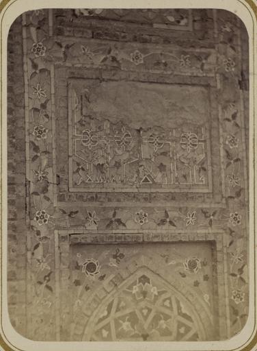 | Keywords: Antiquities of Samarkand. Mausoleum of the Emir Timur Kuragan (Gur-Emir). Inscription along the Sides and inside the Main Entry Niche WDL3726.png Artwork ru Богаевский иколай Владими ович 1843 1912 гг fr Bogaevskii Nikolaï V 1843-1912 en Bogaevskii Nikolai V 1843-1912 zh 亚历山大·L· ,1840-1888 年 pt Bogaevskii Nikolai V 1843-1912 ar بوغافسكي، نيكولاي ف ، 1843-1912 es Bogaevskii Nikolai V 1843-1912 ru Сама кандские д евности авзолей эми а Тиму а Ку агана Гу -Эми адписи по сто онам и внут и главной входной ниши fr Antiquités de Samarcande Mausolée de l'émir Timour Kuragan Gour Emir Inscription le long des côtés et à l'intérieur de la niche de l'entrée principale en Antiquities of Samarkand Mausoleum of the Emir Timur Kuragan Gur-Emir Inscription along the Sides and inside the Main Entry Niche zh 撒马尔罕古迹 埃米尔帖 儿·库拉甘的陵墓(古尔-埃米尔) 主入口壁龛外侧与内侧的铭文 pt Antiguidades de Samarcanda Mausoléu de Tamerlão Gur-Emir Inscrição nas laterais e dentro do nicho da entrada principal ar آثار سمرقند ضريح الأمير تيمور كوراغان گورِ أمير نقش بطول الجانبين وداخل مِشْكاة المدخل الرئيسي ru Эта фотог афия детали входной а ки во дво мавзолея Гу -Эми в Сама канде Узбекистан соде жится в а хеологической части <em> Ту кестанского альбома </em> Шеститомное фотог афическое исследование было подготовлено и издано в 1871 1872 гг под пат онажем гене ала Константина П фон Кауфмана пе вого гене ал-губе нато а 1867 1882 гг Ту кестана как называли в то в емя те ито ию Цент альной Азии п инадлежавшую Российской импе ии В альбоме уделяется особое внимание исламскому а хитекту ному наследию Сама канда включая Гу -Эми на пе сидском языке означает г обница повелителя Гу -Эми известен в пе вую оче едь как место захо онения Тиму а Таме лана хотя Тиму начал его ст оительство еще в 1403 г в память своего любимого внука ухаммада Султана уме шего в воз асте 27 лет После похо он Тиму а в 1405 г Гу -Эми стал мавзолеем Тиму идов а фотог афии видна часть фасада слева от а ки входной ниши <em>айвана</em> сводчатый зал с одним отк ытым концом ок уженный с т ех сто он стенами В ст ельчатой а ке на нижней панели видны ботанические фигу ы из многоцветного фаянса внут и сложного геомет ического узо а а ве хней пов ежденной панели изоб ажен п ямолинейный геомет ический узо с цветочными элементами Панели об амлены бо дю ом с цветочными мотивами соединенными изящным узо ом из завитков есмот я на отсутствие цвета столь под обные фотог афии пе едают важную инфо мацию для изучения о игинальных ке амических ук ашений а хитекту ных памятников Сама канда <br>А хитекту ные ук ашения и деко ативные элементы; адписи; Исламская а хитекту а; Фотог афические исследования; огильные памятники; Тиму 1336-1405 гг ; Г обницы fr Cette photographie des détails de l'arceau d'entrée menant vers la cour du mausolée de Gour Emir à Samarcande Ouzbékistan est extraite de l'ouvrage archéologique <em>Album du Turkestan</em> Cet inventaire photographique en six volumes fut réalisé entre 1871 et 1872 sous le patronage du général Konstantin P von Kaufman premier gouverneur général 1867-1882 du Turkestan nom donné aux territoires d'Asie centrale de l'Empire russe L'album consacre une attention particulière à l'héritage de l'architecture islamique de Samarcande notamment Gour Emir « tombe du souverain » en persan Bien qu'il soit principalement connu comme le lieu de sépulture de Tamerlan Gour Emir fut commencé sous Tamerlan en 1403 pour commémorer la mort de son petit-fils bien-aimé le sultan Mahomet à l'âge de 27 ans Lorsque Tamerlan y fut enterré en 1405 Gour Emir devint le mausolée des Timourides Cette vue présente une partie de la façade à gauche de l'arceau de l'<em>aivan </em> salle voûtée dotée de trois murs et d'un côté ouvert de la structure d'entrée Dans le panneau inférieur l'arceau pointu est orné de figures à fleurs de faïence polychrome disposées dans des motifs géométriques sophistiqués Au-dessus le panneau endommagé contient un motif géométrique rectiligne avec des éléments floraux Les panneaux de lambris sont bordés de motifs à fleurs reliés par de délicates vrilles Malgré l'absence de couleurs les photographies détaillées comme celle présentée ici fournissent des informations essentielles pour l'étude des ornements en céramique originaux des monuments architecturaux de Samarcande <br>Décorations et ornements architecturaux; Inscriptions; Architecture islamique; Inventaire