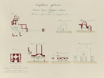 Keywords: Antiquities of Samarkand. Mausoleum of Khodzha Abdu-Deruni Ishrat-Khan. Plans, Elevations, and Sections WDL3577.png Artwork ru Богаевский иколай Владими ович 1843 1912 гг fr Bogaevskii Nikolaï V 1843-1912 en Bogaevskii Nikolai V 1843-1912 zh 亚历山大·L· ,1840-1888 年 pt Bogaevskii Nikolai V 1843-1912 ar بوغافسكي، نيكولاي ف ، 1843-1912 es Bogaevskii Nikolai V 1843-1912 ru Сама кандские д евности авзолей Ходжа Абду-Да ун и Иш ат-хана Планы фасады и аз езы fr Antiquités de Samarcande Mausolée de Khodzha Abdu-Deruni Ishrat-Khan Plans élévations et sections en Antiquities of Samarkand Mausoleum of Khodzha Abdu-Deruni Ishrat-Khan Plans Elevations and Sections zh 撒马尔罕古迹 贾·阿布 -德伦 伊 拉特汗的墓葬 平 图 立 图和截 图 pt Antiguidades de Samarcanda Mausoléu de Khodzha Abdu-Deruni Ishrat-Khan Planos elevações e seções ar آثار سمرقند ضريح خواجه عبده-ديروني عِشْرَت-خان التصميمات والمساقط الأمامية والمقاطع ru Эти планы фасады и аз езы двух мемо иальных комплексов в Сама канде Узбекистан соде жатся в а хеологической части <em> Ту кестанского альбома </em> Шеститомное фотог афическое исследование было п оведено в 1871 1872 гг под уководством гене ала Константина П фон Кауфмана пе вого гене ал-губе нато а 1867 1882 гг Ту кестана как называли те ито ию Цент альной Азии п инадлежавшую Российской импе ии В альбоме уделяется особое внимание исламскому а хитекту ному наследию Сама канда Ве хние исунки соде жат план мемо иального комплекса Ходжа Абду-Да ун кото ый посвящен почитаемому в IX веке а абскому судье из клана Абди Слово <em>да ун</em> внут енний добавлено в название как символ асположения комплекса в п еделах Сама канда Пе воначальный купольный мавзолей дати уемый ве оятно XII веком в XV веке был асши ен и к нему была добавлена г обница для паломничества Комплекс также включает в себя бассейн мечеть и главный вход а нижних исунках изоб ажено пог ебальное соо ужение Иш ат-хана кото ое как п едполагают было пост оено в 1464 г по п иказу Хабибы Султан Бегум жены Абу Саида в качестве мавзолея для женщин и детей из династии Тиму идов Этот цент ализованный к естооб азный мавзолей с высоким куполом был ок ужен двухэтажными вспомогательными ст оениями включающими в себя мечеть вестибюль для умывания <em>мион-са ай</em> и ко идо ведущий к склепу К тому в емени когда были сделаны эти исунки большая часть ве хней ст укту ы мавзолея ухнула но его монументальные фо мы впечатляют до сих по <br>А хитекту ные че тежи; Исламская а хитекту а; П оекции; огильные памятники; Г обницы fr Ce dessin de plan d'élévation et de sections de l'intérieur du mausolée de Gour Emir à Samarcande Ouzbékistan est extrait de l'ouvrage archéologique <em>Album du Turkestan</em> Cet inventaire photographique en six volumes fut réalisé entre 1871 et 1872 sous le patronage du général Konstantin P von Kaufman premier gouverneur général 1867-1882 du Turkestan nom donné aux territoires d'Asie centrale de l'Empire russe L'album consacre une attention particulière à l'héritage de l'architecture islamique de Samarcande Les dessins de la partie supérieure incluent le plan du grand ensemble commémoratif de Khodzha Abdu-Derun dédié à un juge arabe vénéré du IX<sup>e</sup> siècle du clan d'Abdi Le mot <em>derun</em> intérieur a été ajouté pour indiquer son emplacement dans Samarcande Le mausolée d'origine en forme de dôme datant probablement du XII<sup>e</sup> siècle fut agrandi avec un sanctuaire de pèlerinage au XV<sup>e</sup> siècle Le grand ensemble comprend également un bassin une mosquée et un portail d'entrée Les dessins de la partie inférieure illustrent le sanctuaire d'Ishrat-khan On pense que sa construction date de 1464 et qu'elle fut entreprise à la demande d'Habib Sultan Begum une épouse d'Abu Saïd afin d'ériger un mausolée pour les femmes et les enfants de la dynastie Timouride Ce mausolée centralisé et cruciforme avec un dôme élevé était encadré de deux structures secondaires à deux étages contenant une mosquée un vestibule pour la toilette <em>mion-sarai</em> et un passage vers la crypte funéraire Lorsque ces dessins furent réalisés la majeure partie de la structure supérieure du mausolée était effondrée mais sa forme monumentale était encore impressionnante <br>Dessins architecturaux; Architecture islamique; Projections; Monuments funéraires; Tombes en These plans sections and elevations of two memorial complexes in Samarkand Uzbekistan are from the archeological part of <em>Turkestan Album</em> The six-volum