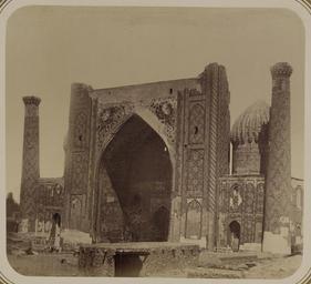 Keywords: Antiquities of Samarkand. Shir Dar Madrasah. Built by Yalanktush Bagadur, Vezir to Imam-Quli Khan in 1648 (1058 Hegira). View of the Main Facade (Western Side) WDL3793.png Artwork ru Богаевский иколай Владими ович 1843 1912 гг fr Bogaevskii Nikolaï V 1843-1912 en Bogaevskii Nikolai V 1843-1912 zh 亚历山大·L· ,1840-1888 年 pt Bogaevskii Nikolai V 1843-1912 ar بوغافسكي، نيكولاي ف ، 1843-1912 es Bogaevskii Nikolai V 1843-1912 ru Сама кандские д евности ед есе Ши -До Пост оена Яланктушем Багаду ом визи ем Имам-Кули Хана в 1648 г 1058 г хидж ы Вид главного фасада западная сто она fr Antiquités de Samarcande Madrasa de Shir Dar Construite par Yalanktush Bagadur vizir d'Imam-Quli Khan en 1648 1058 de l'hégire Vue de la façade principale côté ouest en Antiquities of Samarkand Shir Dar Madrasah Built by Yalanktush Bagadur Vezir to Imam-Quli Khan in 1648 1058 Hegira View of the Main Facade Western Side zh 撒马尔罕古迹 尔·达伊斯兰教学校 由伊玛尼-屈力汗的维齐儿(译注:伊斯兰教国家高官)亚兰克图 ·巴加 尔 1648 年 伊斯兰历 1058 年)建 主立 (西侧)景观 pt Antiguidades de Samarcanda Madrassa Shir Dar Construído por Yalanktush Bagadur vizir de Imam-Quli Khan em 1648 hégira 1058 Imagem da fachada principal lado ocidental ar آثار سمرقند مدرسة شيردور بناها يالانكتوش بغادور، وزير إمام قولي خان في 1648 1058 هجرياً منظر للواجهة الرئيسة الجهة الغربية ru Эта фотог афия мед есе Ши -До в Сама канде Узбекистан соде жится в а хеологической части <em> Ту кестанского альбома </em> Шеститомное фотог афическое исследование было п оведено в 1871 1872 гг под уководством гене ала Константина П фон Кауфмана пе вого гене ал-губе нато а 1867 1882 гг Ту кестана как называли те ито ию Цент альной Азии п инадлежавшую Российской импе ии В альбоме уделяется особое внимание исламской а хитекту е Сама канда в том числе памятникам XIV и XV вв пе иода п авления Тиму а Таме лана и его п еемников В цент е Сама канда находится ансамбль Регистан объединяющий в себе т и основных об азца <em>madrasah</em> мед есе елигиозных школ Вто ая мед есе в ансамбле Ши -До была пост оена в 1619 1636 гг во в емена буха ской династии Ашта ханидов Здесь показан главный фасад в цент е кото ого находится <em>iwan</em> сводчатый зал с одним отк ытым концом ок уженный с т ех сто он стенами являющийся одним из самых к асивых фасадов в Цент альной Азии азвание означает место обитания львов указывая на двух сви епых хищных зве ей по обе сто оны а ки Они кажется напоминают тиг ов а спине каждого зве я изоб ажено человекоподобное лицо воплощающее дух ге альдического зве я По сто онам фасада асположены два мина ета также пок ытые ке амической отделкой В углах возле мина етов находятся еб истые купола возвышающиеся над учебными залами Хотя асположенная в активной сейсмической зоне мед есе Ши -До п ете пела уще б ст оение относительно хо ошо сох анилось <br>Исламская а хитекту а; ед есе; Фотог афические исследования fr Cette photographie de la madrasa de Shir Dar à Samarcande Ouzbékistan est extraite de l'ouvrage archéologique <em>Album du Turkestan</em> Cet inventaire photographique en six volumes fut réalisé entre 1871 et 1872 sous le patronage du général Konstantin P von Kaufman premier gouverneur général 1867-1882 du Turkestan nom donné aux territoires d'Asie centrale de l'Empire russe L'album consacre une attention particulière à l'architecture islamique de Samarcande avec notamment des monuments datant des XIV<sup>e</sup> et XV<sup>e</sup> siècles lors du règne de Tamerlan et de ses successeurs Situé au centre de Samarcande l'ensemble du Registan est composé de trois exemples majeurs de <em>madrasa</em> école religieuse La deuxième madrasa de l'ensemble celle de Shir Dar fut construite entre 1619 et 1636 au cours de la dynastie astrakane de Bukhara La façade principale est présentée ici avec au centre l'<em>aivan</em> salle voûtée dotée de trois murs et d'un côté ouvert affichant l'une des façades les plus spectaculaires d'Asie centrale Le nom de la madrasa signifie « habitat des lions » et fait référence aux deux fauves rampants des deux côtés de l'arceau Il semble qu'il s'agisse de tigres Au dos de chacun des fauves un visage humanoïde représentant l'esprit de la bête héraldique apparaît La façade est encadrée de deux minarets également recouverts de décoration en céramique Dans les angles près des minarets des dômes striés émergent au-dessus des salles d'enseignement Malgré les dommages dus à l'activité sismique de cette r