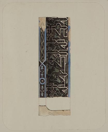 Keywords: Antiquities of Samarkand. Tomb of the Saint Kusam-ibn-Abbas (Shah-i Zindah) and Adjacent Mausoleums. Mausoleum of Khodzha Akhmed. Sections of Inscriptions on the Front Facade WDL3904.png Artwork ru Шостак Л А fr Shostak L A en Shostak L A zh L A ·斯塔克 pt Shostak L A ar شوستاك، ل أ es Shostak L A ru Сама кандские д евности Г обница святого Куссама ибн Абасса Шах-Зиндэ и мавзолеи п и ней авзолей Ходжи Ахмеда Части надписей на главном фасаде fr Antiquités de Samarcande Sépulcre de Kusam-ibn-Abbas Shah-i Zindah et mausolées adjacents Mausolée de Khodzha Akhmed Sections des inscriptions sur la façade en Antiquities of Samarkand Tomb of the Saint Kusam-ibn-Abbas Shah-i Zindah and Adjacent Mausoleums Mausoleum of Khodzha Akhmed Sections of Inscriptions on the Front Facade zh 撒马尔罕古迹 库萨姆-伊 -阿巴斯之墓(夏伊辛达)及其邻近陵墓 贾·艾哈迈德陵墓 正立 上的部分铭文 pt Antiguidades de Samarcanda Túmulo do Santo Kusam-ibn-Abbas Shah-i Zindah e mausoléus adjacentes Mausoléu de Khodzha Akhmed Seção das inscrições na fachada frontal ar آثار سمرقند ضَرِيح الوَلِيّ قثم بن عباس شاه زنده والأضرحة المجاورة ضريح خواجه أحمد أجزاء من النقوش الموجودة على الواجهة الأمامية ru Эта аква ель с изоб ажением ф агмента фасада мавзолея Ходжи Ахмеда асположенного на те ито ии нек ополя Шах-Зиндэ в Сама канде соде жится в а хеологической части <em> Ту кестанского альбома </em> Шеститомное фотог афическое исследование было подготовлено и издано в 1871 1872 гг под пат онажем гене ала Константина П фон Кауфмана пе вого гене ал-губе нато а 1867 1882 гг Ту кестана как называли в то в емя те ито ию Цент альной Азии п инадлежавшую Российской импе ии В альбоме уделяется особое внимание исламской а хитекту е Сама канда в том числе памятникам XIV и XV вв пе иода п авления Тиму а Таме лана и его п еемников Шах-Зиндэ в пе еводе с пе сидского живой ца ь почитается как мемо иал Куссама ибн Абасса двою одного б ата п о ока ухаммада П едполагается что мавзолей Ходжа Ахмада был пост оен в 1360-х гг для местного духовного лиде а Этот частично пов ежденный памятник асположенный в конце п охода нек ополиса в севе ной г уппе г обниц ук ашен я ким многоцветным ке амическим о наментом с цветочными геомет ическими и буквенными узо ами А ка фасада или <em>пештак</em> с обеих сто он ок ужена езными глазу ованными колоннами из те акоты и полосами с надписями сложной геомет ической фо мы а данном исунке изоб ажен ф агмент левой сто оны а ки на кото ом стилизованные куфические буквы сочетаются с пе еплетающимся витиеватым мотивом есмот я на свою уп ощенность подобные аква ельные эскизы соде жат инфо мацию о цвете кото ую невозможно было пе едать п и помощи фотог афий того в емени <br>А хитекту ные ук ашения и деко ативные элементы; Исламская а хитекту а; огильные памятники; Шах-Зиндэ; Г обницы; Аква ельные исунки fr Cette aquarelle d'un détail de façade du mausolée de Khodzha Akhmed de la nécropole de Shah-i Zindah à Samarcande est extraite de l'ouvrage archéologique <em>Album du Turkestan</em> Cet inventaire photographique en six volumes fut réalisé entre 1871 et 1872 sous le patronage du général Konstantin P von Kaufman premier gouverneur général 1867-1882 du Turkestan nom donné aux territoires d'Asie centrale de l'Empire russe L'album consacre une attention particulière à l'architecture islamique de Samarcande avec notamment des monuments datant des XIV<sup>e</sup> et XV<sup>e</sup> siècles lors du règne de Tamerlan et de ses successeurs L'ensemble de Shah-i Zindah « roi vivant » en persan est un mémorial dédié à la vénération de Kusam-ibn-Abbas cousin du prophète Mahomet Le mausolée de Khodzha Akhmed fut construit dans les années 1360 vraisemblablement pour un chef spirituel Situé au bout du passage de la nécropole au nord de l'ensemble des sanctuaires ce monument en partie endommagé présente encore des ornements en céramique polychromes exceptionnels composés de motifs à fleurs géométriques et épigraphiques L arceau de façade ou <em>peshtak</em> est flanqué de colonnes en terre cuite vernissée et de bandes d inscriptions sculptées décorées de motifs géométriques complexes Cette esquisse du côté gauche de l arceau montre un fragment composé de lettres coufiques à motifs avec des vrilles entrelacées Bien que simplifiées ces esquisses à l'aquarelle fournissent des informations relatives aux couleurs qui ne sont pas disponibles sur l