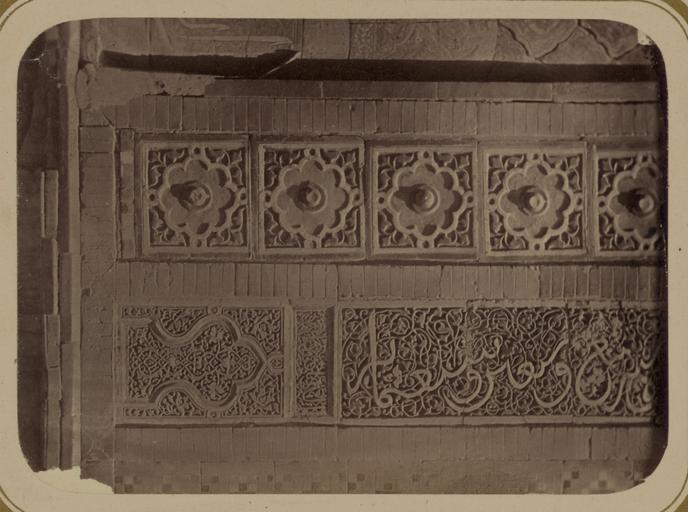 Keywords: Antiquities of Samarkand. Tomb of the Saint Kusam-ibn-Abbas (Shah-i Zindah) and Adjacent Mausoleums. Mausoleum of the Aine Khane (Emir Mussa) WDL3626.png Artwork ru Богаевский иколай Владими ович 1843 1912 гг fr Bogaevskii Nikolaï V 1843-1912 en Bogaevskii Nikolai V 1843-1912 zh 亚历山大·L· ,1840-1888 年 pt Bogaevskii Nikolai V 1843-1912 ar بوغافسكي، نيكولاي ف ، 1843-1912 es Bogaevskii Nikolai V 1843-1912 ru Сама кандские д евности Г обница святого Куссама ибн Абасса Шах-Зиндэ и мавзолеи п и ней авзолей Айнэ-Ханэ эми а уссы адпись с датой ст оительства с левой сто оны фасада fr Antiquités de Samarcande Sépulcre de Kusam-ibn-Abbas Shah-i Zindah et mausolées adjacents Mausolée d'Aine Khane émir Mussa Inscription datant la construction du bâtiment à gauche de la façade en Antiquities of Samarkand Tomb of the Saint Kusam-ibn-Abbas Shah-i Zindah and Adjacent Mausoleums Mausoleum of the Aine Khane Emir Mussa Inscription Dating the Building Construction to the Left of the Facade zh 撒马尔罕古迹 库萨姆-伊 -阿巴斯之墓(夏伊辛达)及其邻近陵墓 艾内·克哈内(埃米尔·穆萨)陵墓 立 左侧标明建筑建 日 的铭文 pt Antiguidades de Samarcanda Túmulo do Santo Kusam-ibn-Abbas Shakhi Zinda e mausoléus adjacentes Mausoléu de Aine Khane Emir Mussa Inscrição datando a construção do edifício à esquerda da fachada ar آثار سمرقند ضَرِيح الوَلِيّ قثم بن عباس شاه زنده والأضرحة المجاورة ضريح عين خان الأمير موسى نقش يؤرخ تأسيس المبنى بالجانب الأيسر من الواجهة ru Эта фотог афия о намента из ке амической плитки на мавзолее Туглу-Текин эми а Хуссейна в нек ополе Шах-Зиндэ в Сама канде соде жится в а хеологической части <em> Ту кестанского альбома </em> Шеститомное фотог афическое исследование было подготовлено и издано в 1871 1872 гг под пат онажем гене ала Константина П фон Кауфмана пе вого гене ал-губе нато а 1867 1882 гг Ту кестана как называли в то в емя те ито ию Цент альной Азии п инадлежавшую Российской импе ии В альбоме уделяется особое внимание исламской а хитекту е Сама канда в том числе памятникам XIV и XV вв пе иода п авления Таме лана и его п еемников Шах-Зиндэ на пе сидском языке означает живой ца ь почитается как мемо иал Куссама ибн Абасса двою одного б ата п о ока ухаммада В 1386 г эми Хуссейн один из п иближенных Таме лана пост оил мавзолей для своей мате и Туглу-Текин Ст оение было се ьезно пов еждено силами п и оды однако фасад и большая часть плиточных ук ашений сох анились а изоб ажении нижней левой части фасада виден многоцветный о намент в том числе плитка майолика аиболее п имечательна ве тикальная надпись а абским письмом в укописном стиле сулюс внут и сложного пе еплетающегося цветочного о намента полностью выполненного из езной глазу ованной те акоты Под надписью находится панель из езной те акоты соде жащая цветочный узо с амкой в фо ме цветка лотоса С левого к ая видна деко ативная ке амическая колонна и основание на внешнем углу фасада <br>А хеологические объекты; А хитекту ные ук ашения и деко ативные элементы; адписи; Исламская а хитекту а; Фотог афические исследования; огильные памятники; Шах-Зиндэ; Г обницы fr Cette photographie des ornements en carreaux de céramique du mausolée de Tuglu-Tekin émir Hussein situé dans la nécropole de Shah-i Zindah à Samarcande est extraite de l'ouvrage archéologique <em>Album du Turkestan</em> Cet inventaire photographique en six volumes fut réalisé entre 1871 et 1872 sous le patronage du général Konstantin P von Kaufman premier gouverneur général 1867-1882 du Turkestan nom donné aux territoires d'Asie centrale de l'Empire russe L'album consacre une attention particulière à l'architecture islamique de Samarcande avec notamment des monuments datant des XIV<sup>e</sup> et XV<sup>e</sup> siècles lors du règne de Tamerlan et de ses successeurs L'ensemble de Shah-i Zindah « roi vivant » en persan est un mémorial dédié à la vénération de Kusam-ibn-Abbas cousin du prophète Mahomet En 1386 l'émir Hussein un des notables de Tamerlan fit construire un mausolée pour sa mère Tuglu-Tekin Bien que la structure ait été considérablement endommagée par des causes naturelles la façade et la plupart de ses carreaux ornementaux existent encore aujourd'hui Cette vue de la partie inférieure gauche de la façade présente les ornements polychromes notamment les carreaux de majolique L'inscription verticale e