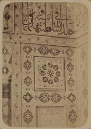 | Keywords: Antiquities of Samarkand. Tomb of the Saint Kusam-ibn-Abbas (Shah-i Zindah) and Adjacent Mausoleums. Mausoleum of the Aine Khane (Emir Mussa). Inscription on the Upper Right Panel of the Niche WDL3628.png Artwork ru Богаевский иколай Владими ович 1843 1912 гг fr Bogaevskii Nikolaï V 1843-1912 en Bogaevskii Nikolai V 1843-1912 zh 亚历山大·L· ,1840-1888 年 pt Bogaevskii Nikolai V 1843-1912 ar بوغافسكي، نيكولاي ف ، 1843-1912 es Bogaevskii Nikolai V 1843-1912 ru Сама кандские д евности Г обница святого Куссама ибн Абасса Шах-Зиндэ и мавзолеи п и ней авзолей Айнэ-Ханэ эми а уссы адпись на ве хней п авой панели ниши fr Antiquités de Samarcande Sépulcre de Kusam-ibn-Abbas Shah-i Zindah et mausolées adjacents Mausolée d'Aine Khane émir Mussa Inscription sur le panneau supérieur droit de la niche en Antiquities of Samarkand Tomb of the Saint Kusam-ibn-Abbas Shah-i Zindah and Adjacent Mausoleums Mausoleum of the Aine Khane Emir Mussa Inscription on the Upper Right Panel of the Niche zh 撒马尔罕古迹 库萨姆-伊 -阿巴斯之墓(夏伊辛达)及其邻近陵墓 艾内·克哈内(埃米尔·穆萨)陵墓 壁龛右上方嵌 上的铭文 pt Antiguidades de Samarcanda Túmulo do Santo Kusam-ibn-Abbas Shakhi Zinda e mausoléus adjacentes Mausoléu de Aine Khane Emir Mussa Inscrição no painel direito superior do nicho de entrada ar آثار سمرقند ضَرِيح الوَلِيّ قثم بن عباس شاه زنده والأضرحة المجاورة ضريح عين خان الأمير موسى نقش على اللوحة اليمنى العليا للمِشْكاة ru Эта фотог афия деко ативной ке амики на мавзолее Туман-Ака в нек ополе Шах-Зиндэ в Сама канде соде жится в а хеологической части <em> Ту кестанского альбома </em> Шеститомное фотог афическое исследование было подготовлено и издано в 1871 1872 гг под пат онажем гене ала Константина П фон Кауфмана пе вого гене ал-губе нато а 1867 1882 гг Ту кестана как называли в то в емя те ито ию Цент альной Азии п инадлежавшую Российской импе ии В альбоме уделяется особое внимание исламской а хитекту е Сама канда в том числе памятникам XIV и XV вв пе иода п авления Таме лана и его п еемников Особенно следует отметить ансамбль Шах-Зиндэ на пе сидском языке означает живой ца ь кото ый почитается как мемо иал Куссама ибн Абасса двою одного б ата п о ока ухаммада авзолей и мечеть Туман-Ака пост оенные в 1405 г как мемо иал в честь младшей жены Таме лана асположены слева от <em>ча така</em> в севе ной г уппе г обниц Ансамбль п имечателен я кими ке амическими ук ашениями с цветочными и геомет ическими узо ами и надписями Этот элемент асположен в ве хней левой сто оне ниши об азованной а кой мавзолея <em>пештак</em> В ве хней и нижней части находятся надписи выполненные а абским письмом в стиле сулюс В цент е асположен цветочный узо с восемью лепестками Панель об амлена полосами с соединенными деко ативными фигу ами С левого к ая видна капитель колонны в левом углу ниши <br>А хеологические объекты; А хитекту ные ук ашения и деко ативные элементы; адписи; Исламская а хитекту а; Фотог афические исследования; огильные памятники; Шах-Зиндэ; Г обницы fr Cette photographie des céramiques décorant le mausolée de Tuman-Aka situé dans la nécropole de Shah-i Zindah à Samarcande est extraite de l'ouvrage archéologique <em>Album du Turkestan</em> Cet inventaire photographique en six volumes fut réalisé entre 1871 et 1872 sous le patronage du général Konstantin P von Kaufman premier gouverneur général 1867-1882 du Turkestan nom donné aux territoires d'Asie centrale de l'Empire russe L'album consacre une attention particulière à l'architecture islamique de Samarcande avec notamment des monuments datant des XIV<sup>e</sup> et XV<sup>e</sup> siècles lors du règne de Tamerlan et de ses successeurs L'ensemble de Shah-i Zindah « roi vivant » en persan est un mémorial dédié à la vénération de Kusam-ibn-Abbas cousin du prophète Mahomet Bâtis en 1405 comme mémorial dédié à la plus jeune épouse de Tamerlan le mausolée et la mosquée de Tuman-Aka sont situés à gauche du <em>chartak</em> au nord des sanctuaires L'ensemble est remarquable pour ses ornements en céramique exceptionnels composés de motifs à fleurs géométriques et épigraphiques Cette vue présente un détail de la partie supérieure gauche de la niche formée par l'arceau du mausolée <em>peshtak</em> Des inscriptions arabes en style cursif thoulouth apparaissent dans les parties supérieure et inférieure de la photographie Au centre un motif à fleurs comporte huit « pétales » Le panneau es