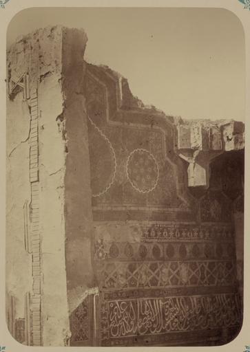 | Keywords: Antiquities of Samarkand. Tomb of the Saint Kusam-ibn-Abbas (Shah-i Zindah) and Adjacent Mausoleums. Mausoleum of Emir Assad. View of the Preserved Upper Section of the Entry Niche WDL3651.png Artwork ru Богаевский иколай Владими ович 1843 1912 гг fr Bogaevskii Nikolaï V 1843-1912 en Bogaevskii Nikolai V 1843-1912 zh 亚历山大·L· ,1840-1888 年 pt Bogaevskii Nikolai V 1843-1912 ar بوغافسكي، نيكولاي ف ، 1843-1912 es Bogaevskii Nikolai V 1843-1912 ru Сама кандские д евности Г обница святого Куссама ибн Абасса Шах-Зиндэ и мавзолеи п и ней авзолей эми а Ассада Изоб ажение сох анившейся ве хней части входной ниши fr Antiquités de Samarcande Sépulcre de Kusam-ibn-Abbas Shah-i Zindah et mausolées adjacents Mausolée de l'émir Assad Vue de la section supérieure préservée de la niche d'entrée en Antiquities of Samarkand Tomb of the Saint Kusam-ibn-Abbas Shah-i Zindah and Adjacent Mausoleums Mausoleum of Emir Assad View of the Preserved Upper Section of the Entry Niche zh 撒马尔罕古迹 库萨姆-伊 -阿巴斯之墓(夏伊辛达)及其邻近陵墓 埃米尔·阿萨德的陵墓 现存入口壁龛上半部分 pt Antiguidades de Samarcanda Túmulo do Santo Kusam-ibn-Abbas Shakhi Zinda e mausoléus adjacentes Mausoléu do Emir Assad Imagem da seção superior preservada do nicho de entrada ar آثار سمرقند ضَرِيح الوَلِيّ قثم بن عباس شاه زنده والأضرحة المجاورة ضريح الأمير أسد منظر للجزء العلوي ذي الحالة الجيدة من مِشْكاة المدخل ru Эта фотог афия безымянного мавзолея в нек ополе Шах-Зиндэ в Сама канде соде жится в а хеологической части <em> Ту кестанского альбома </em> Шеститомное фотог афическое исследование было подготовлено и издано в 1871 1872 гг под пат онажем гене ала Константина П фон Кауфмана пе вого гене ал-губе нато а 1867 1882 гг Ту кестана как называли в то в емя те ито ию Цент альной Азии п инадлежавшую Российской импе ии В альбоме уделяется особое внимание исламской а хитекту е Сама канда в том числе памятникам XIV и XV вв пе иода п авления Таме лана и его п еемников Особенно следует отметить ансамбль Шах-Зиндэ на пе сидском языке означает живой ца ь кото ый почитается как мемо иал Куссама ибн Абасса двою одного б ата п о ока ухаммада С еди г обниц нек ополя находится безымянный мавзолей основное здание кото ого аз ушено Сох анившиеся части фасада п едставляют собой сложную деко ативную пове хность похожую на отделку соседнего мавзолея Усто Али около 1380 г а этом снимке показана левая сто она ниши об азованной ог омной а кой фасада Разнооб азные ке амические ук ашения сочетают многоцветную полосу с а абским письмом в укописном стиле сулюс; полосу плитки майолики с ельефными линиями об азующими пе ек естный геомет ический исунок; деко ативные полосы с лиственными и геомет ическими узо ами; сложные фаянсовые панели с цветочными мотивами а также вве ху сп ава остатки деко ативного свода с сотовой пове хностью <em>mocárabe</em> над входом <br>А хитекту ные ук ашения и деко ативные элементы; Исламская а хитекту а; Фотог афические исследования; огильные памятники; Шах-Зиндэ; Г обницы fr Cette photographie d'un mausolée non identifié situé dans la nécropole de Shah-i Zindah à Samarcande est extraite de l'ouvrage archéologique <em>Album du Turkestan</em> Cet inventaire photographique en six volumes fut réalisé entre 1871 et 1872 sous le patronage du général Konstantin P von Kaufman premier gouverneur général 1867-1882 du Turkestan nom donné aux territoires d'Asie centrale de l'Empire russe L'album consacre une attention particulière à l'architecture islamique de Samarcande avec notamment des monuments datant des XIV<sup>e</sup> et XV<sup>e</sup> siècles lors du règne de Tamerlan et de ses successeurs L'ensemble de Shah-i Zindah « roi vivant » en persan est un mémorial dédié à la vénération de Kusam-ibn-Abbas cousin du prophète Mahomet Parmi les sanctuaires de la nécropole la structure de base d'un mausolée non identifié s'est effondrée Les parties de façade encore existantes aujourd'hui révèlent des décorations complexes semblables à celles du mausolée d'Usto Ali à proximité en 1380 environ Cette vue présente le côté gauche de la niche formée par le grand arceau de la façade Les ornements en céramique incluent notamment une bande polychrome contenant une écriture arabe cursive en style thoulouth une bande de carreaux de majolique avec des lignes en relief formant des dessins géométriques de croisemen