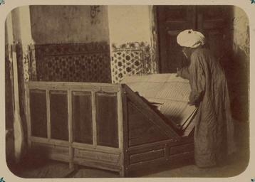| Keywords: Antiquities of Samarkand. Tomb of the Saint Kusam-ibn-Abbas (Shah-i Zindah) and Adjacent Mausoleums. Mosque (khanaka) of Shah-i Zindah. Reading-Stand with a Qur'an Donated by Emir Nasrullah of Bukhara WDL3684.png  Artwork ru Богаевский  иколай Владими ович 1843 1912 гг fr Bogaevskii Nikolaï V 1843-1912 en Bogaevskii Nikolai V 1843-1912 zh 亚历山大·L· ,1840-1888 年 pt Bogaevskii Nikolai V 1843-1912 ar بوغافسكي، نيكولاي ف ، 1843-1912 es Bogaevskii Nikolai V 1843-1912 ru Сама кандские д евности Г обница святого Куссама ибн Абасса Шах-Зиндэ и мавзолеи п и ней  ечеть ханака Шах-Зиндэ Пюпит с Ко аном поже твованным буха ским эми ом  ас уллой fr Antiquités de Samarcande Sépulcre de Kusam-ibn-Abbas Shah-i Zindah et mausolées adjacents Mosquée khanaka de Shah-i Zindah Pupitre avec un Coran donné par l'émir Nasrullah de Boukhara en Antiquities of Samarkand Tomb of the Saint Kusam-ibn-Abbas Shah-i Zindah and Adjacent Mausoleums Mosque khanaka of Shah-i Zindah Reading-Stand with a Qur'an Donated by Emir Nasrullah of Bukhara zh 撒马尔罕古迹  库萨姆-伊 -阿巴斯之墓(夏伊辛达)及其邻近陵墓 夏伊辛达清 寺(纪念 建筑群) 带 布哈拉的埃米尔·纳斯鲁拉捐赠的古兰经的诵经台 pt Antiguidades de Samarcanda Túmulo do Santo Kusam-ibn-Abbas Shah-i Zindah e mausoléus adjacentes Mesquita khanaka de Shah-i Zindah Suporte de leitura com um Alcorão doado pelo Emir Nasrullah de Bucara ar آثار سمرقند ضَرِيح الوَلِيّ قثم بن عباس شاه زنده والأضرحة المجاورة مسجد خانكة شاه زنده منصة قراءة عليها مصحف تبرع به أمير نصر الله البخارى ru Эта фотог афия внут енней части мечети в мемо иальном ансамбле Куссама ибн Абасса  асположенного в севе ной г уппе г обниц нек ополя Шах-Зиндэ в Сама канде соде жится в а хеологической части <em> Ту кестанского альбома </em> Шеститомное фотог афическое исследование было подготовлено и издано в 1871 1872 гг под пат онажем гене ала Константина П  фон Кауфмана пе вого гене ал-губе нато а 1867 1882 гг Ту кестана как называли в то в емя те  ито ию Цент альной Азии п инадлежавшую Российской импе ии В альбоме уделяется особое внимание исламской а хитекту е Сама канда в том числе памятникам XIV и XV вв пе иода п авления Тиму а Таме лана и его п еемников Комплекс Шах-Зиндэ на пе сидском языке означает живой ца ь почитается как место паломничества и мемо иал Куссама ибн Абасса двою одного б ата п о ока  ухаммада  а снимке изоб ажен ве ующий пе ед де евянным де жателем Ко ана <em>rihal</em> в самом большом ст оении ансамбля мемо иальной мечети или <em>ханаке</em> пост оенной в пе вой половине XV века <em>Rihal</em> подде живает большой Ко ан согласно надписи в альбоме поже твованный буха ским эми ом  ас уллой Стены за <em>rihal</em> частично пок ыты многоцветной ке амикой с геомет ическим мотивом об азованным пе есекающимися линиями в фо ме шестиконечных звезд  а ве хней части с едней стены видны остатки надписи Две ь сп ава ведет в д угие комнаты этого комплекса мавзолеев <br>Ко ан; Подставки для Ко ана;  ечети; Фотог афические исследования;  огильные памятники; Шах-Зиндэ; Духовная жизнь; Г обницы fr Cette photographie de l'intérieur de la mosquée de l'ensemble commémoratif de Kusam-ibn-Abbas situé au nord du groupe de sanctuaires de la nécropole de Shah-i Zindah à Samarcande est extraite de l'ouvrage archéologique <em>Album du Turkestan</em> Cet inventaire photographique en six volumes fut réalisé entre 1871 et 1872 sous le patronage du général Konstantin P von Kaufman premier gouverneur général 1867-1882 du Turkestan nom donné aux territoires d'Asie centrale de l'Empire russe L'album consacre une attention particulière à l'architecture islamique de Samarcande avec notamment des monuments datant des XIV<sup>e</sup> et XV<sup>e</sup> siècles lors du règne de Tamerlan et de ses successeurs Le grand ensemble de Shah-i Zindah « roi vivant » en persan est un site de pèlerinage et un mémorial dédié à la vénération de Kusam-ibn-Abbas cousin du prophète Mahomet Cette vue montre un fidèle devant un <em>rihal</em> porte-Coran en bois à l'intérieur de la plus grande structure de l'ensemble la mosquée commémorative ou <em>khanaka</em> qui date de la première moitié du XV<sup>e</sup> siècle Le rihal soutient un immense coran qui selon la légende de l'album fut donné par l'émir Nasrullah de Boukhara Derrière le rihal les murs sont en partie recouverts de céramiques polychromes décorées de motifs géométriques dont les lignes d'intersection forment des étoiles à six bran