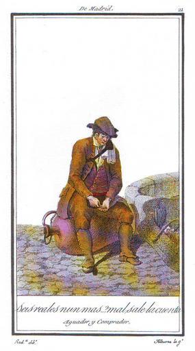 | Keywords: Antonio Rodríguez - Aguador - Madrid.JPG  es Grabado Seis reales nada más Mal sale la cuenta 1802 en el catálogo de 'Trajes de España' dibujado por Antonio Rodríguez Reproducción facsimil de treinta y ocho estampas más catorce variantes de los Trajes de Madrid Todas iluminadas Introducción de Juan Carrete Parrondo Madrid 1989 Coleccion General de los Trajes de Madrid 52 grabados de Antonio Rodríguez Madrid 1801 Facsimil 1989 Edición del Exmo Ayuntamiento de Madrid ISBN 84-7812-069-6 escaneado por el usuario que sube la imagen al repertorio de los Comunes Drawn by Creator Antonio Rodríguez Valencia 1765 - Madrid ca 1825 ; 1801 Unclear-PD-US-old-100 Madrid in the 1800s People of Madrid in art 1801 engravings Engravings from Spain Water sellers from Spain Water sellers in art Cántaros in art Coleccion general de los trajes de Madrid |