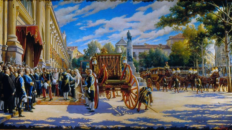 | Keywords: Apertura de las Cortes en 1919 (Asterio Mañanós Martínez).jpg  El lienzo representa la apertura de las Cortes Españolas en 1919 durante el reinado de Alfonso XIII La escena muestra el aspecto que tenía la Plaza de la Marina Española el día 24 de junio de 1919 con motivo de la apertura de las Sesiones de la XXXVIII Legislatura de las Cortes Antonio Maura presidente del Gobierno aparece recibiendo a los reyes Alfonso XIII y Victoria Eugenia de Battemberg que bajan de la carroza 1919 Oil on canvas cm 162 93 Institution Palacio del Senado de España http //www senado es/web/conocersenado/arteypatrimonio/obrapictorica/fondohistorico/detalle/index html id SENPRE_014168 http //www senado es/web/conocersenado/arteypatrimonio/obrapictorica/fondohistorico/detalle/index html id SENPRE_014168 PD-old-80 other versions Uploaded with UploadWizard 20th-century paintings in the Palace of Senate of Spain Portrait paintings of Alfonso XIII of Spain Victoria Eugenie of Battenberg Antoni Maura Paintings by Asterio Mañanós Martínez in the Palace of Senate of Spain 1919 paintings General Courts |