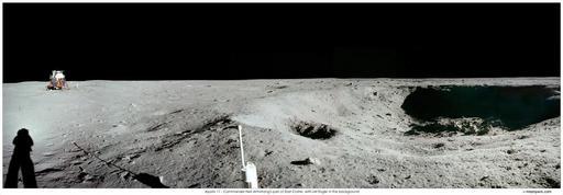 Keywords: project apollo projectapollo apollo xi apolloxi apollo 11 apollo11 eagle lm-5 lm5 lunar module lunarmodule lm grumman lunar module grummanlunarmodule grumman buzz aldrin buzzaldrin aldrin neil armstrong neilarmstrong armstrong moon manned spaceflight mannedspaceflight shadow photographer a2fp photo border outdoor Description On July 20, 1969, Apollo 11 astronauts Neil Armstrong and Edwin "Buzz" Aldrin became the first to walk on the Moon. This panorama of their landing site sweeps across the magnificent desolation of the Moon's Sea of Tranquility, with their Lunar Module, the Eagle, in the background at the far left. East Crater, about 30 meters wide and 4 meters deep, is on the right (scroll right), and was so named because it is about 60 meters east of the Lunar Module. Armstrong had piloted the Eagle safely over the crater. Near the end of his stay on the lunar surface Armstrong strayed far enough from the Lunar Module to take the pictures used to construct this wide-angle view, his shadow appearing at the panorama's left edge. The object near the middle foreground is a stereo close-up camera. Mosaic Assembly: Mike Constantine Description On July 20, 1969, Apollo 11 astronauts Neil Armstrong and Edwin "Buzz" Aldrin became the first to walk on the Moon. This panorama of their landing site sweeps across the magnificent desolation of the Moon's Sea of Tranquility, with their Lunar Module, the Eagle, in the background at the far left. East Crater, about 30 meters wide and 4 meters deep, is on the right (scroll right), and was so named because it is about 60 meters east of the Lunar Module. Armstrong had piloted the Eagle safely over the crater. Near the end of his stay on the lunar surface Armstrong strayed far enough from the Lunar Module to take the pictures used to construct this wide-angle view, his shadow appearing at the panorama's left edge. The object near the middle foreground is a stereo close-up camera. Mosaic Assembly: Mike Constantine |