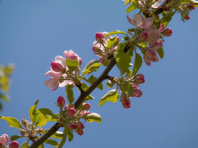 Keywords: apple blossom apple tree bud pink spring blossom bloom apple tree blossom sky road branch bloom