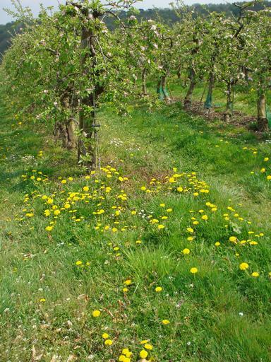 Keywords: apple blossom apple tree blossom bloom white pink apple tree blossom apple tree flowers spring meadow dandelion green nature