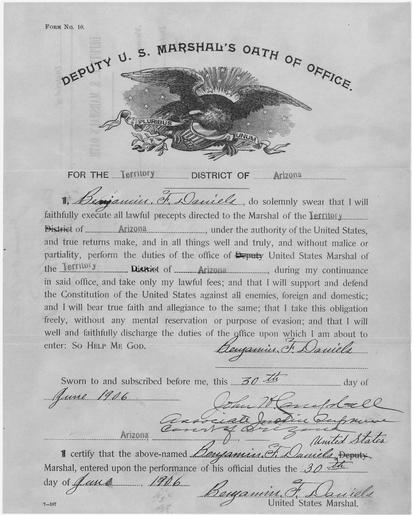 Keywords: Appointment and Oath of Office for Benjamin Daniels as Marshal in the Territory of Arizona. - NARA - 295693.tif Scope and content General notes 295693 Local identifier NARA's Pacific Region Riverside NRHAR 23123 Cajalco Rd Perris CA 92570 1906-06-30 Record group Record Group 527 Records of the U S Marshals Service 1864 - 1992 Record group ARC 764 Appointments and Oaths of U S Marshals and Deputy Marshals compiled 1864 - 1912 Series ARC 295651 File unit File unit ARC Variant control numbers NAIL Control Number NRHL-527-AZ1-42 yes Other versions NARA-cooperation PD-USGov Check categories-NARA 2011 September 13 Documents in English