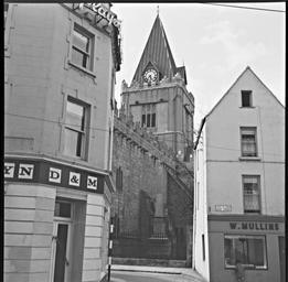 | Keywords: st. nicholas church stnicholaschurch shop street shopstreet sráid na siopaí sráidnasiopaí w. mullins wmullins player's please playersplease boy shops church railings steeple clock 5.37 537 17:37 1737 galway ireland sunday 19th april 1964 1960s sixties james p. o'dea jamespodea collegiate church of st. nicholas collegiatechurchofstnicholas davey & martyn daveymartyn chops mainguard street mainguardstreet churchyard street churchyardstreet graveyard thimble castle thimblecastle butchers butcher shop butchershop connaught connacht national library of ireland nationallibraryofireland o'dea photographic collection odeaphotographiccollection monochrome blackandwhite building architecture outdoor black and white St. Nicholas' Church in Galway City, pictured at 5.37pm or 17:37. Originally thought that W. Mullins was a sweet shop, because the little boy was so glued to the window... However, yellow book tells us Mullins was a butchers shop at this time, and says "A look at Google maps shows that the building is intact but painted a startling lime green - and home to a creperie called Zatsuma. A creperie in Galway City. Who'd have guessed that in 1964?" Thanks to blackpoolbeach for providing us with a Bird's Eye View of this scene, and we're indebted to mcginley2012 for a fantastic historical account of this street corner from Kenny's Old Galway. Apparently in 1894, the lease on the corner shop (locally known as the Thimble Castle) was sold "to the Mullins family who also had it as a butcher shop, until 1995". Date: Sunday, 19 April 1964 NLI Ref.: ODEA 38/77 St. Nicholas' Church in Galway City, pictured at 5.37pm or 17:37. Originally thought that W. Mullins was a sweet shop, because the little boy was so glued to the window... However, yellow book tells us Mullins was a butchers shop at this time, and says "A look at Google maps shows that the building is intact but painted a startling lime green - and home to a creperie called Zatsuma. A creperie in Galway City. Who'd have guessed that in 1964?" Thanks to blackpoolbeach for providing us with a Bird's Eye View of this scene, and we're indebted to mcginley2012 for a fantastic historical account of this street corner from Kenny's Old Galway. Apparently in 1894, the lease on the corner shop (locally known as the Thimble Castle) was sold "to the Mullins family who also had it as a butcher shop, until 1995". Date: Sunday, 19 April 1964 NLI Ref.: ODEA 38/77 |