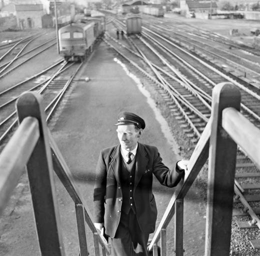 | Keywords: paddy carroll paddycarroll patrick carroll patrickcarroll thurles train station thurlestrainstation thurles railway station thurlesrailwaystation train station trainstation trains tracks signal cabin signalcabin railways railroads c.i.é cié coras iompair éireann corasiompairéireann stairs uniform cap thurles tipperary ireland munster james p. o'dea jamespodea wednesday 26th april 1961 1960s sixties garryvicleheen wagons national library of ireland nationallibraryofireland o'dea photographic collection odeaphotographiccollection blackandwhite monochrome outdoor black and white Here is Mr Paddy Carroll captured heading up the stairs to his Signal Cabin at Thurles Train Station in Co. Tipperary. Wonder if that's a manual in his hand, or a novel he was reading? Date: Wednesday, 26 April 1961 NLI Ref.: ODEA 25/57 Here is Mr Paddy Carroll captured heading up the stairs to his Signal Cabin at Thurles Train Station in Co. Tipperary. Wonder if that's a manual in his hand, or a novel he was reading? Date: Wednesday, 26 April 1961 NLI Ref.: ODEA 25/57 |
