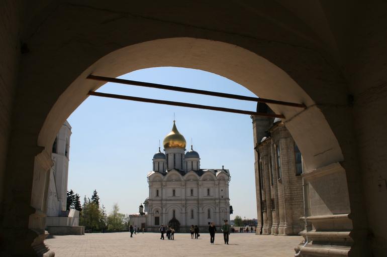 MAKE A MEME View Large Image arch entrance kremlin tourists cathedral of the archangel architecture russian centre of kremlin centre of moscow white building golen onion dome onion dome day time sky