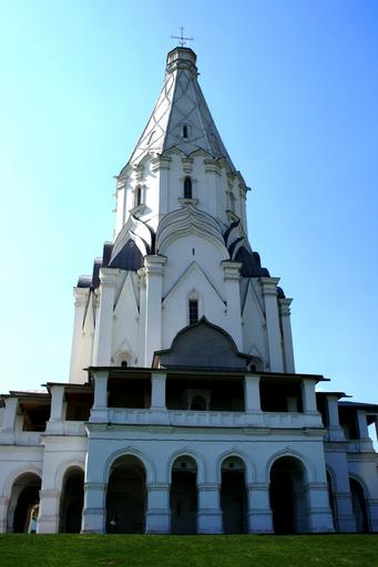 Keywords: architecture building church religion russian orthodox white arches pillars tent roof historic blue sky green grass
