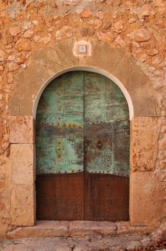 Keywords: architecture building facade home wall goal door input arch old old town historically spain mallorca masonry stones stone wall fornalutx metal wood access antique metal bezel rivet house number